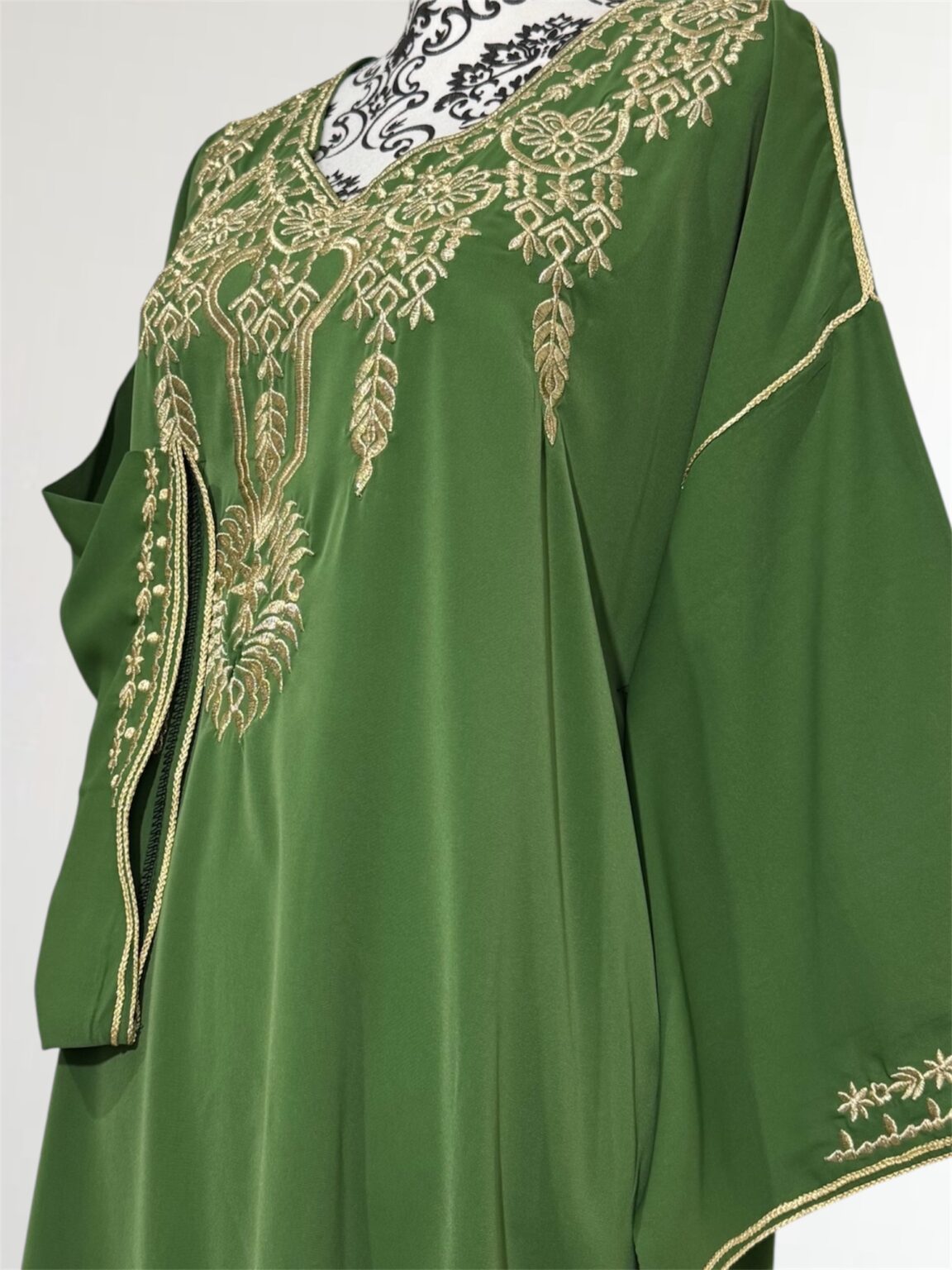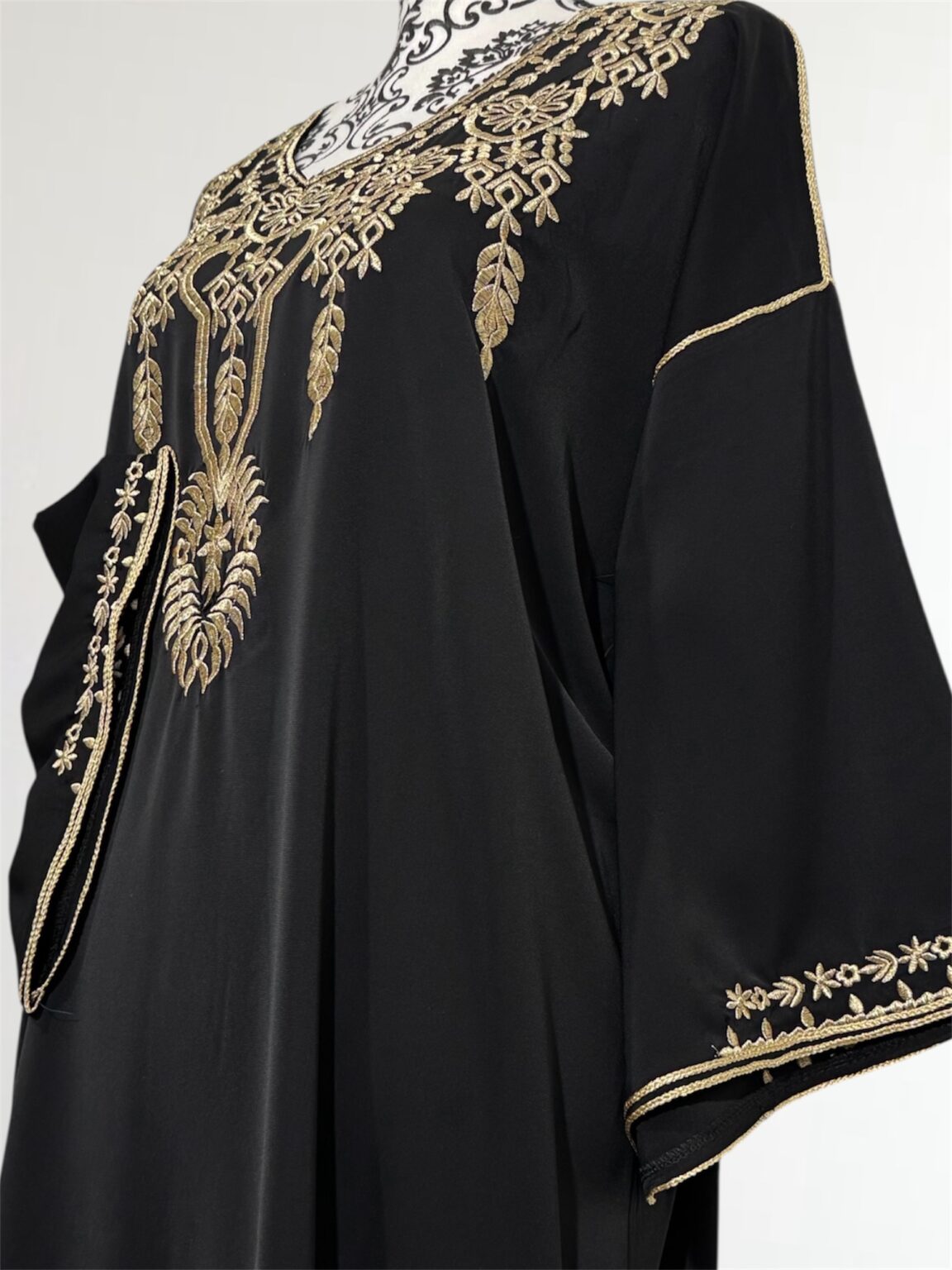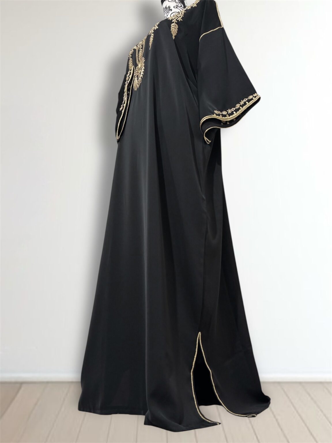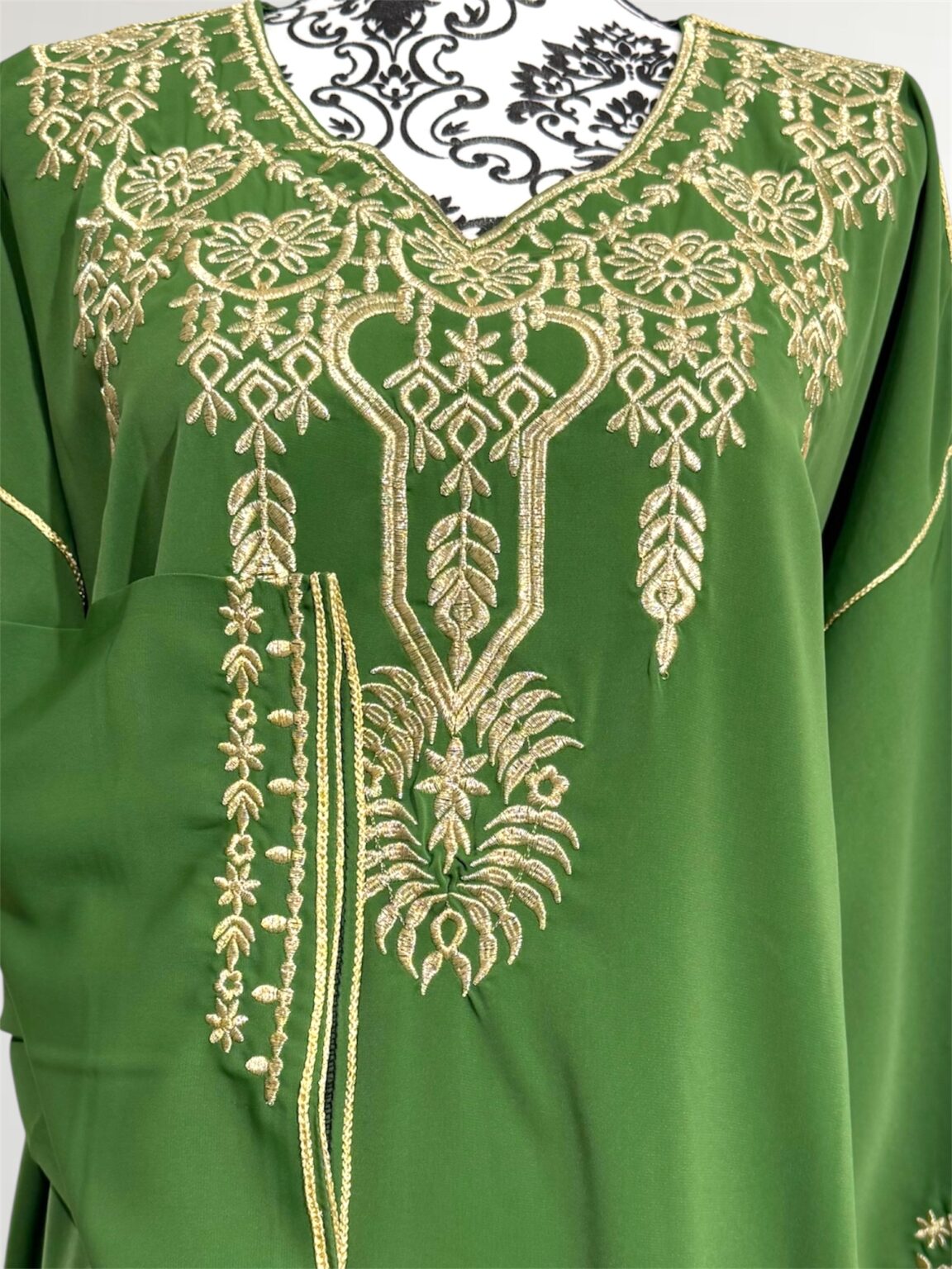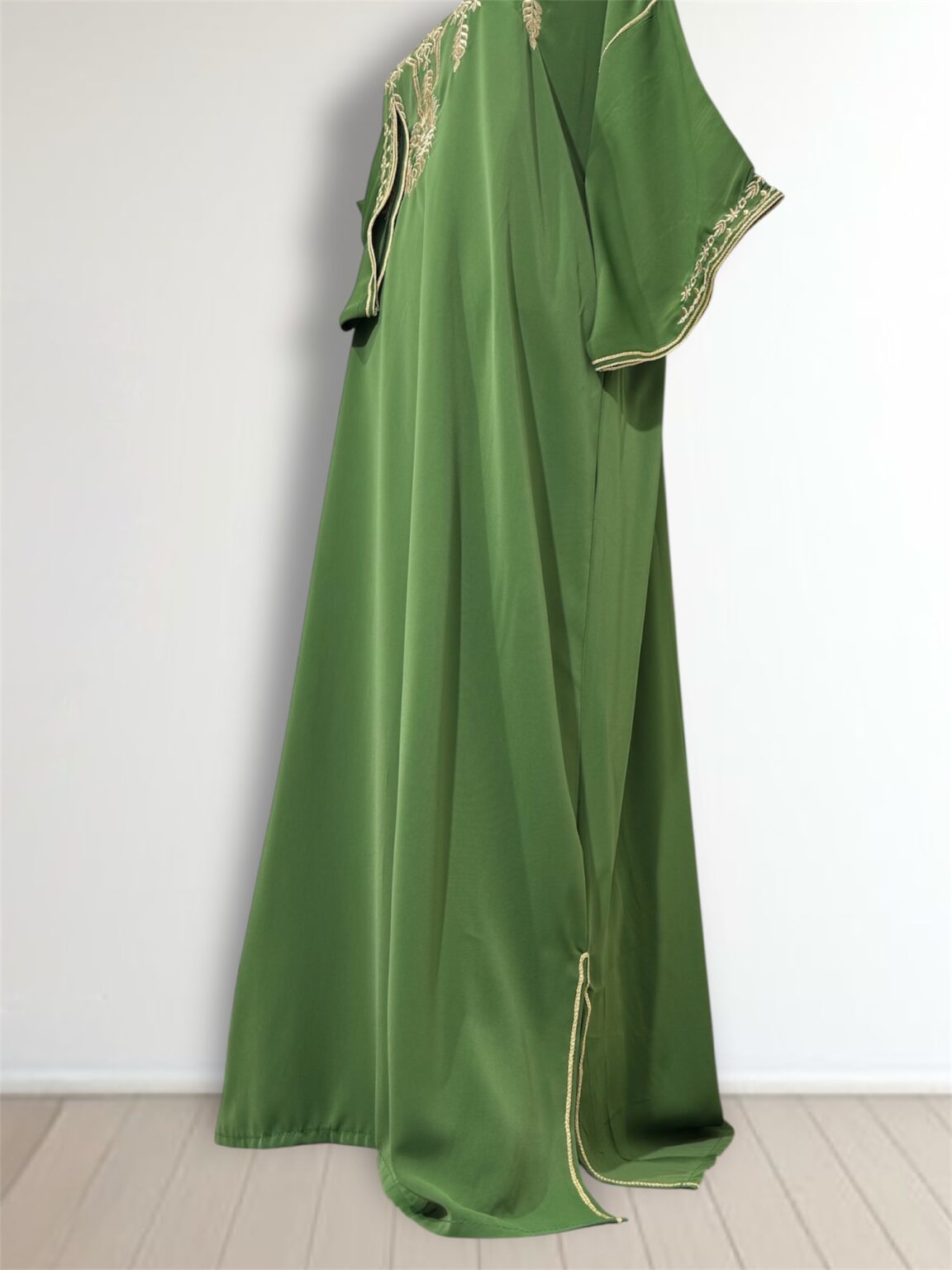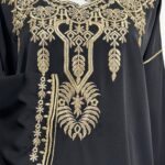 Gandoura qui se porte large, riche en broderies dorées. Sa coupe fluide et ample garantit un confort optimal, tandis que ses finitions délicates lui confèrent une allure raffinée. Cette pièce est parfaite pour vos occasions spéciales ou simplement pour se sentir belle au quotidien.