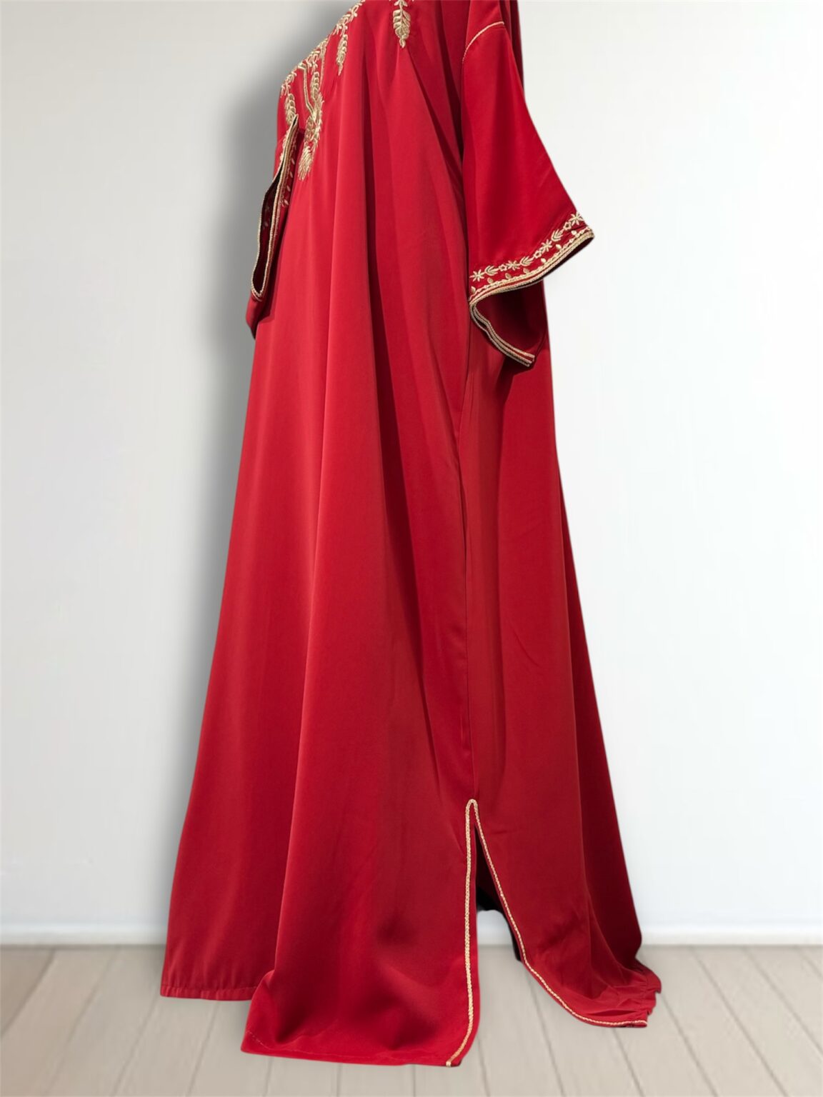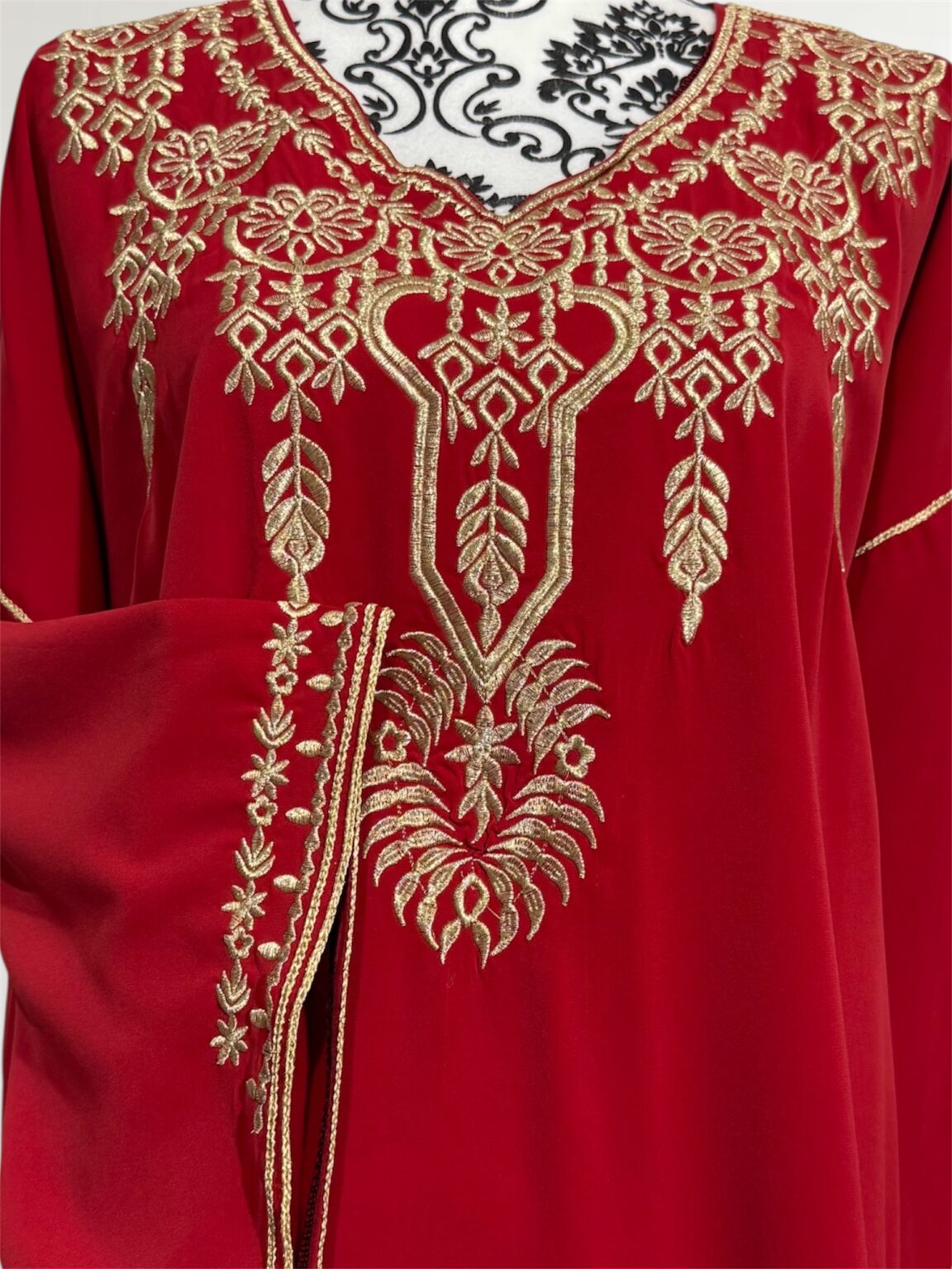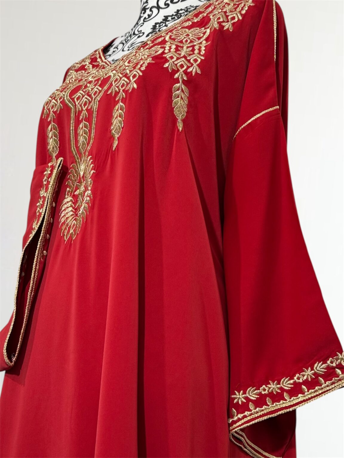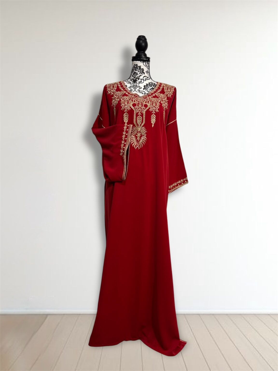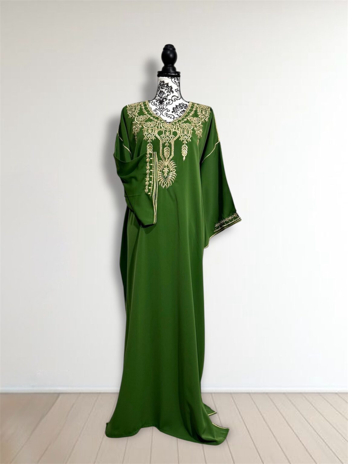 Gandoura qui se porte large, riche en broderies dorées. Sa coupe fluide et ample garantit un confort optimal, tandis que ses finitions délicates lui confèrent une allure raffinée. Cette pièce est parfaite pour vos occasions spéciales ou simplement pour se sentir belle au quotidien.