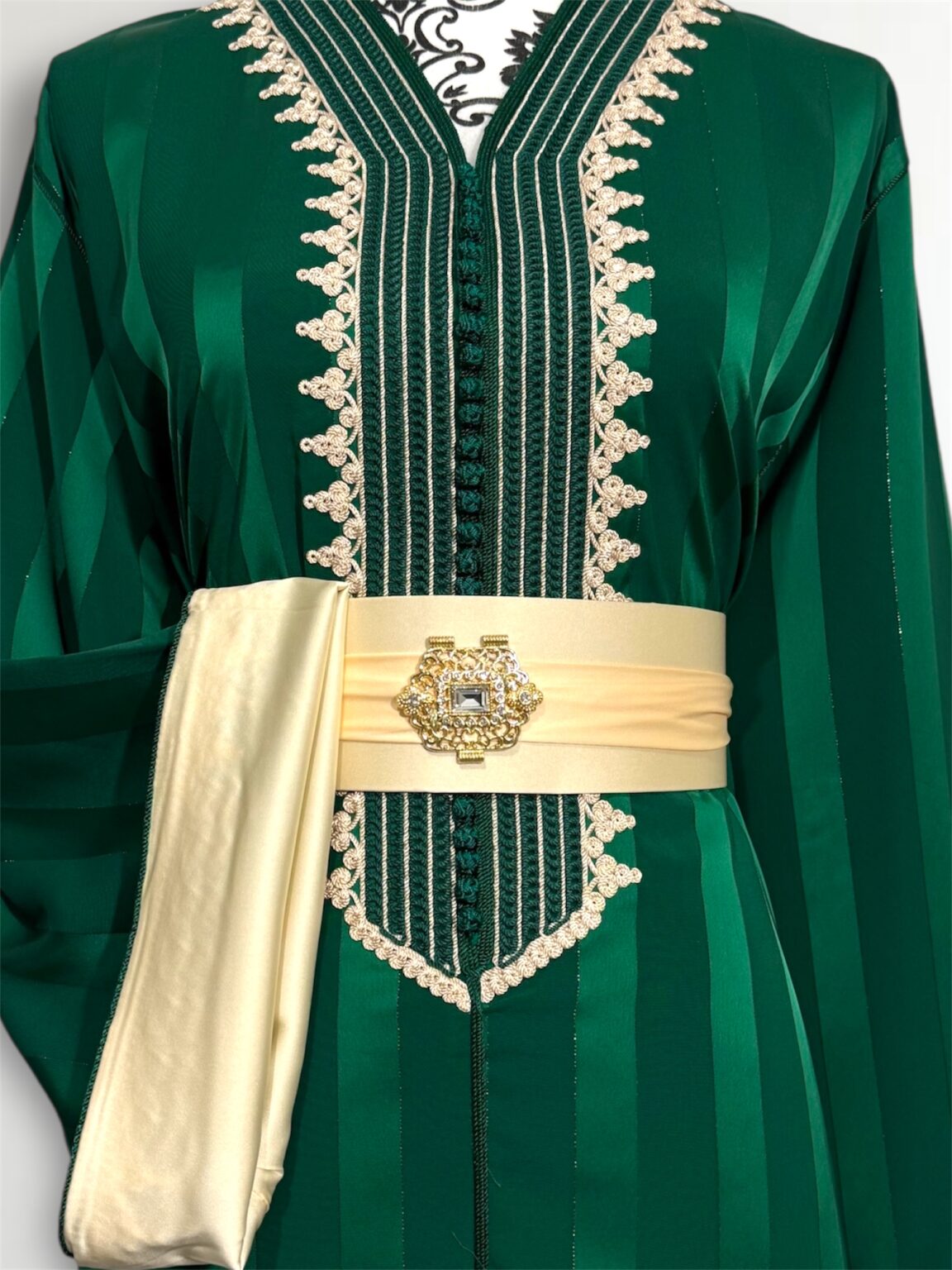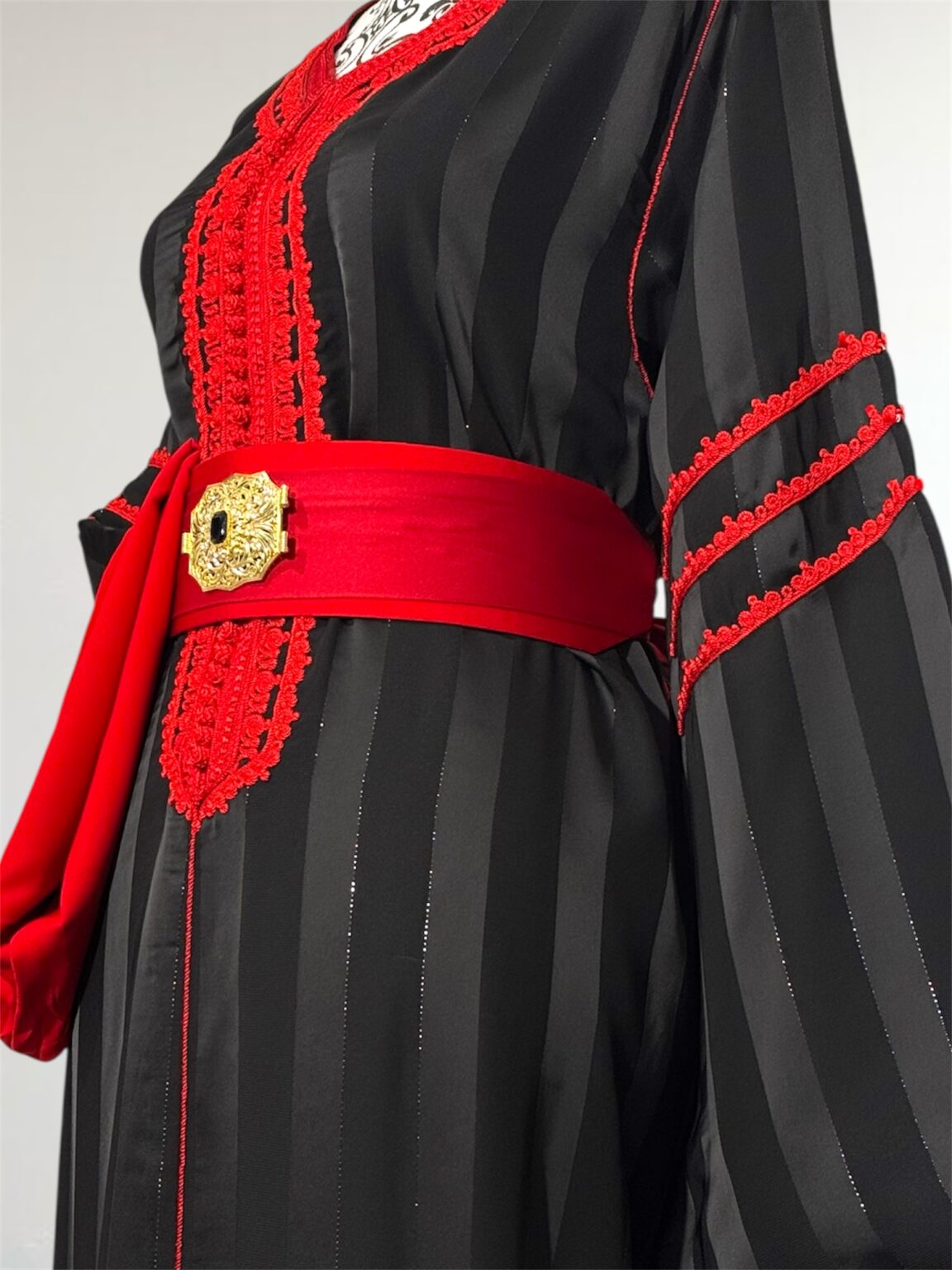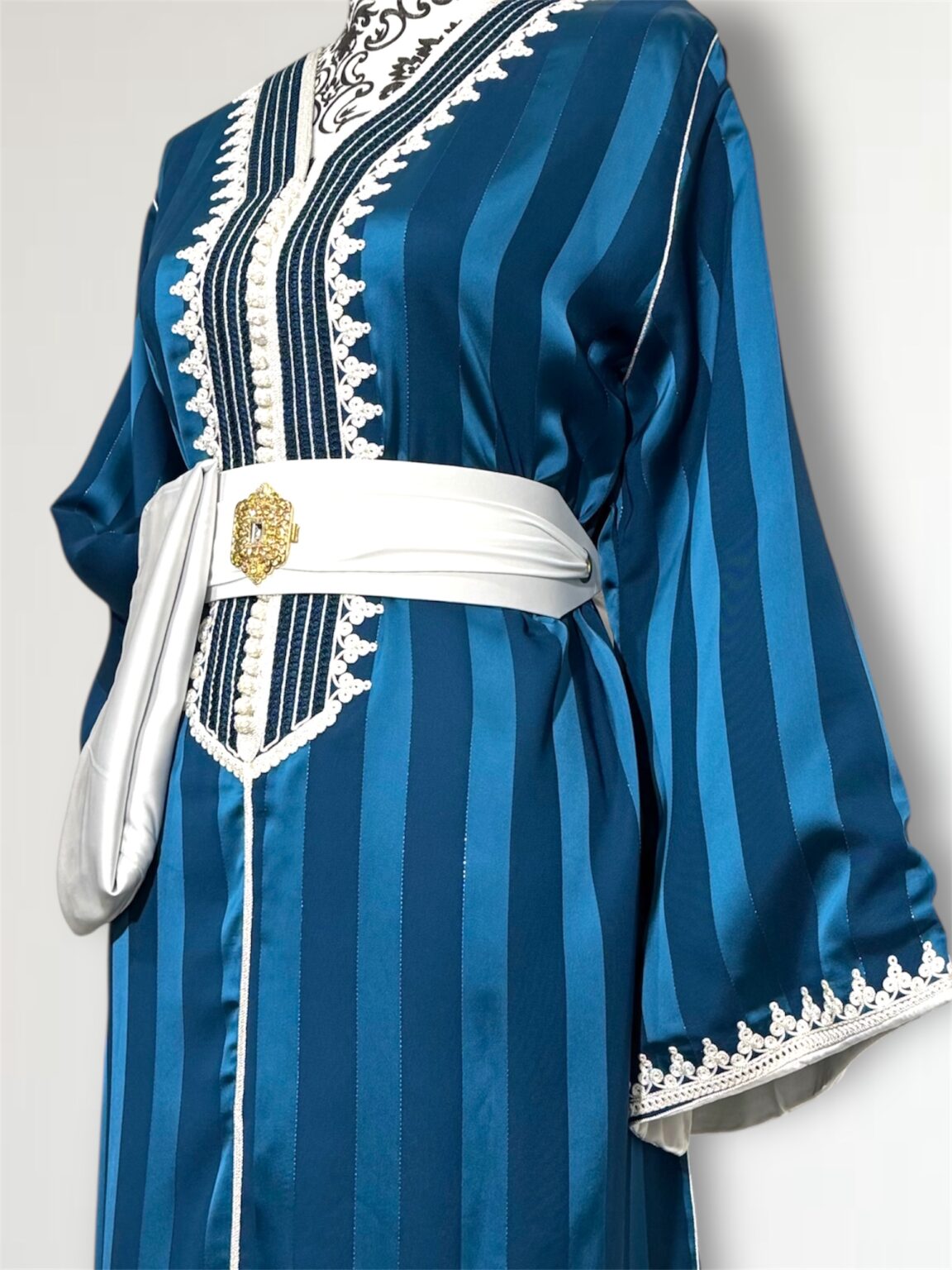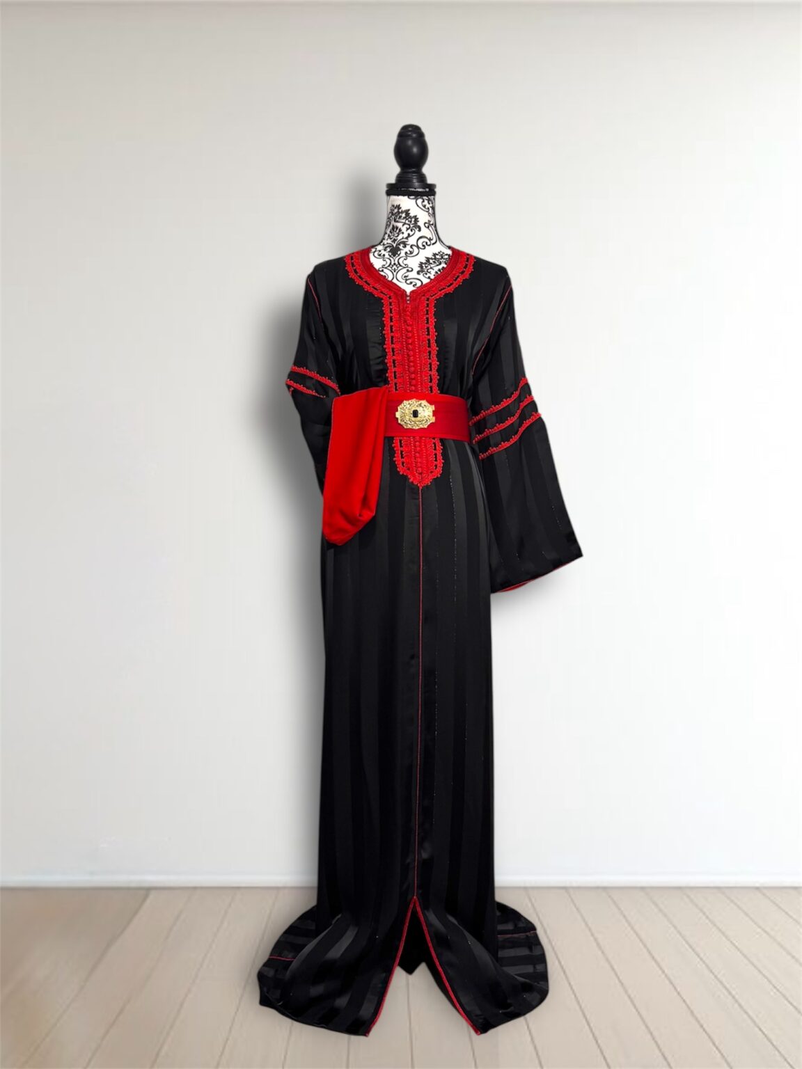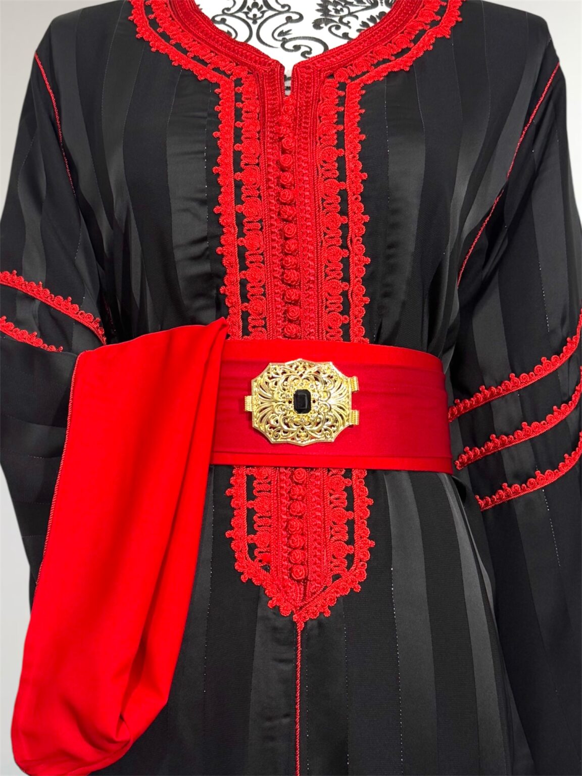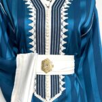 Cette jawhara incarne l’alliance parfaite entre élégance et caractère. Confectionné dans un tissu fluide rehaussé d’une broderie, il sublime la silhouette avec raffinement. La ceinture assortie, ornée d’une boucle dorée, vient marquer la taille et apporter une touche royale à l’ensemble. Idéal pour les grandes occasions, ce modèle se distingue par son contraste audacieux et son style intemporel.