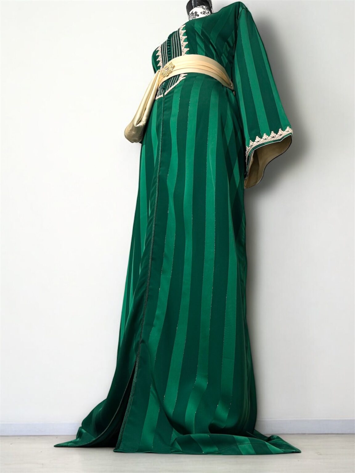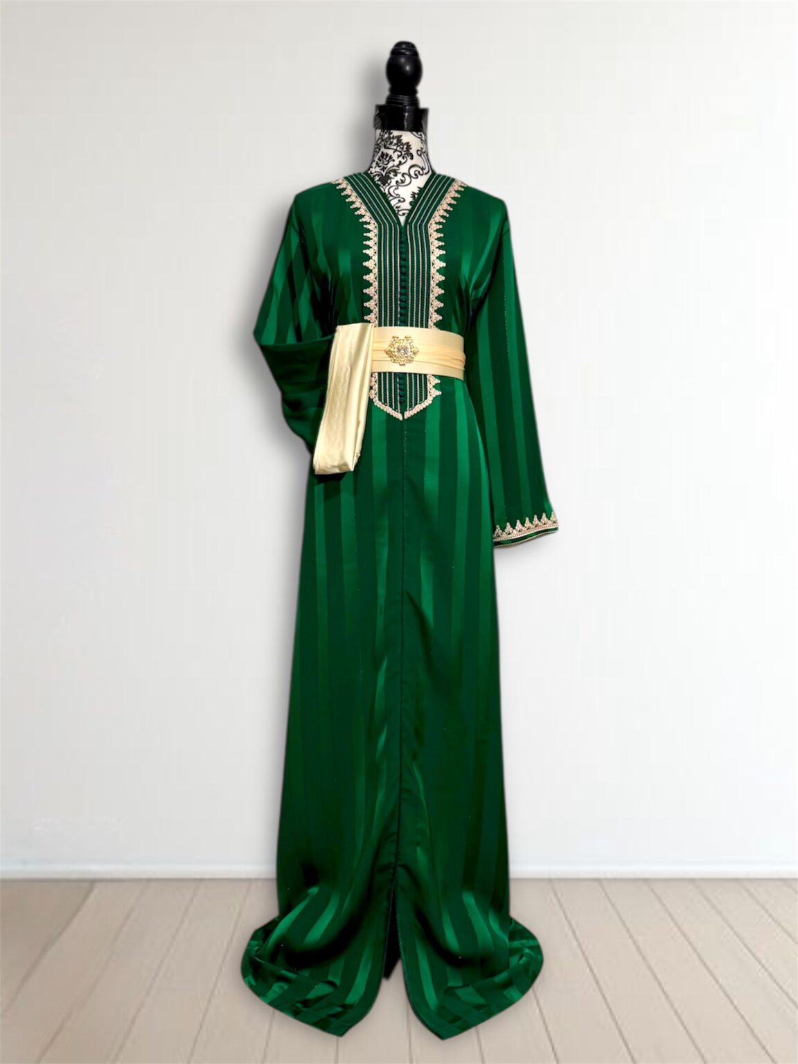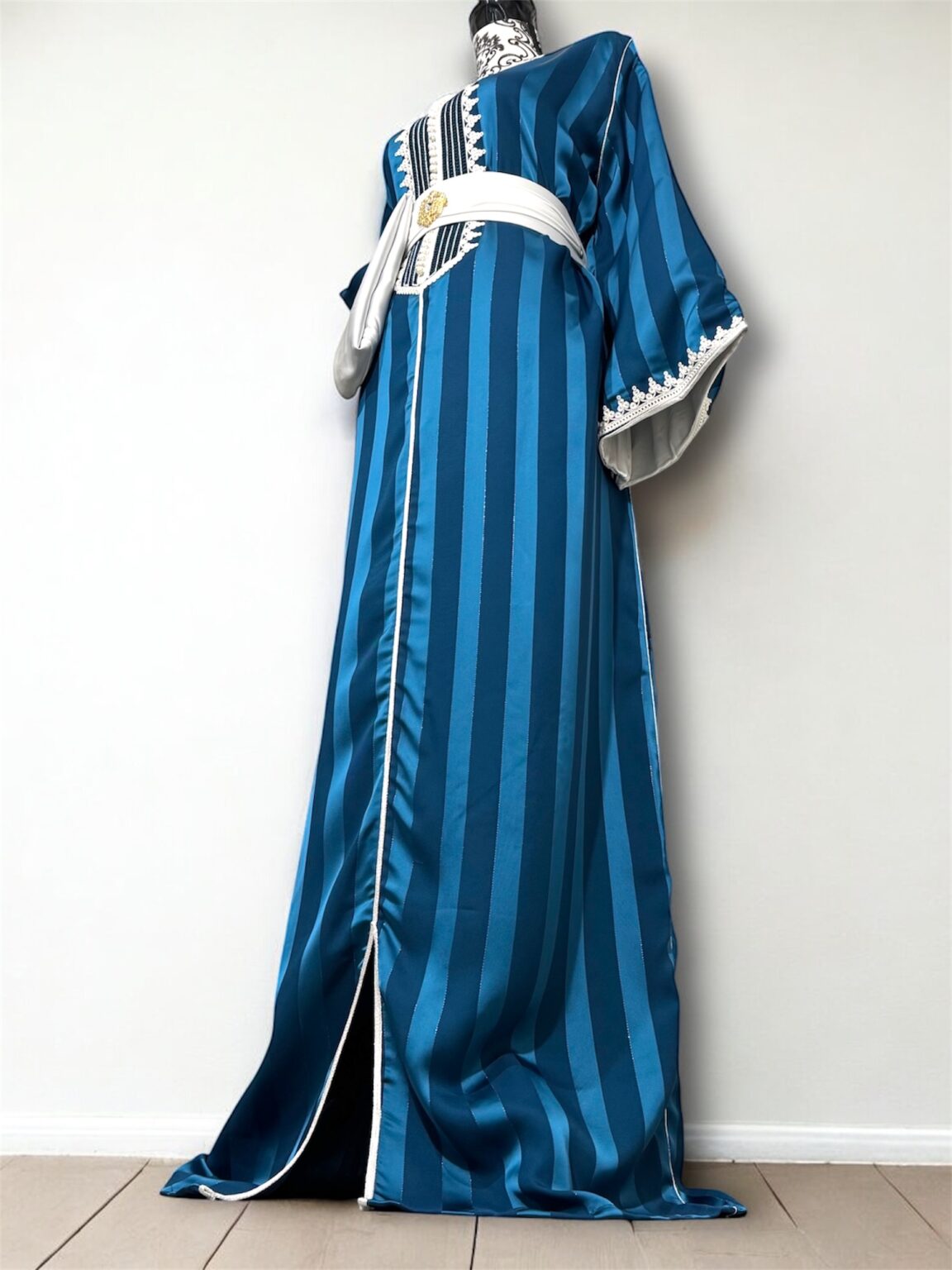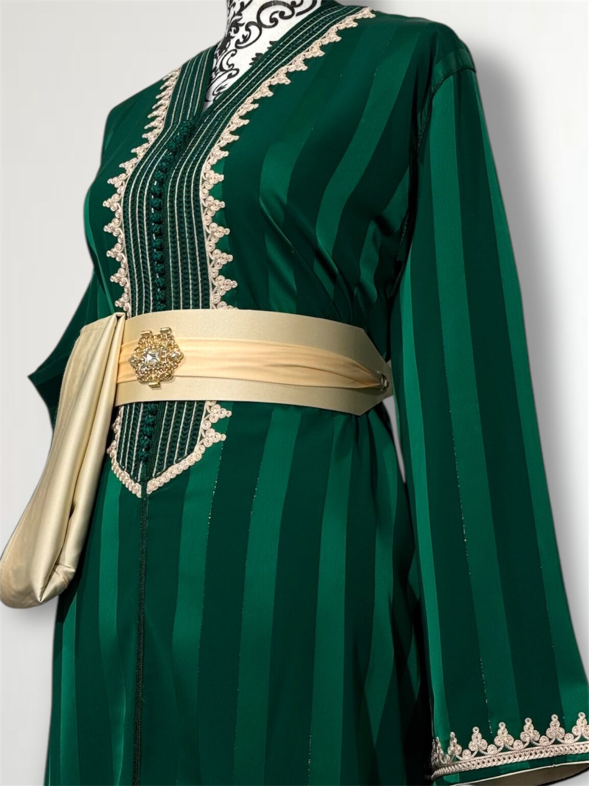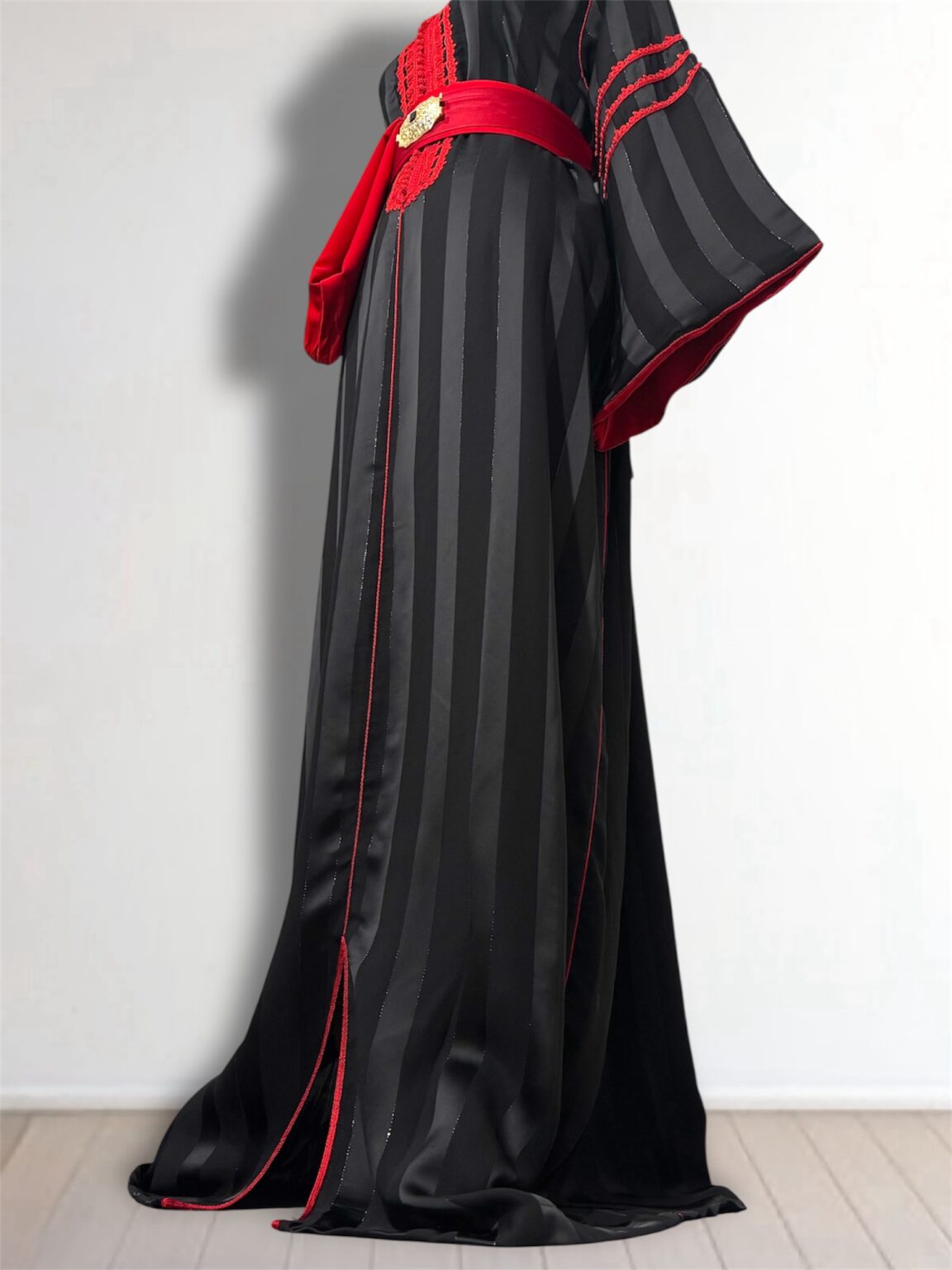Cette jawhara incarne l’alliance parfaite entre élégance et caractère. Confectionné dans un tissu fluide rehaussé d’une broderie, il sublime la silhouette avec raffinement. La ceinture assortie, ornée d’une boucle dorée, vient marquer la taille et apporter une touche royale à l’ensemble. Idéal pour les grandes occasions, ce modèle se distingue par son contraste audacieux et son style intemporel.