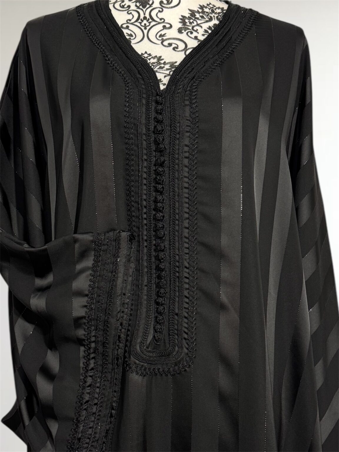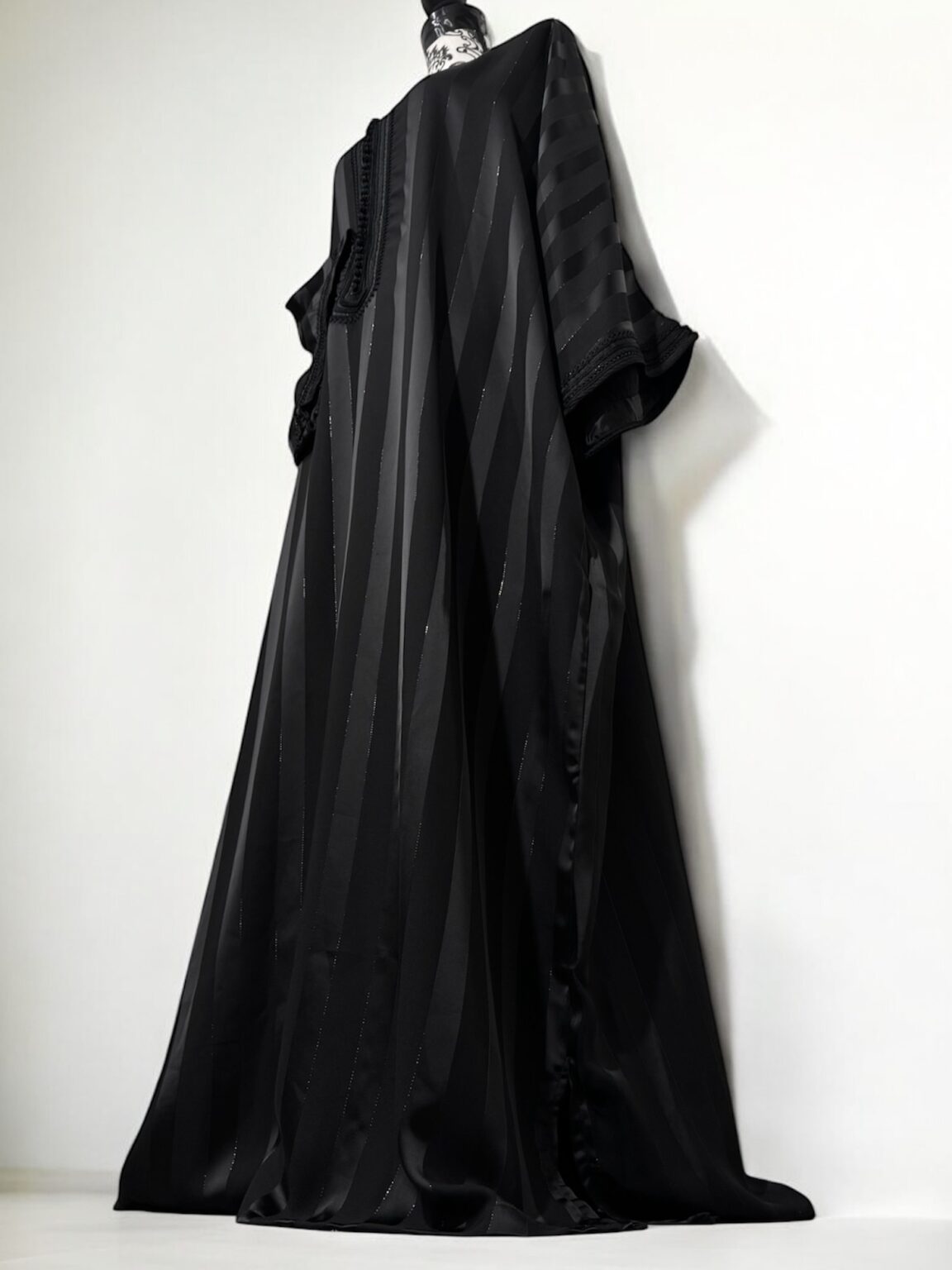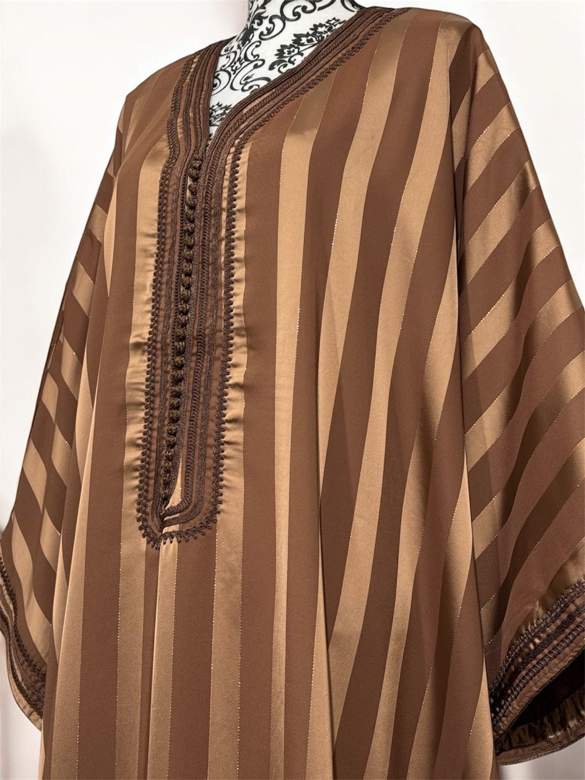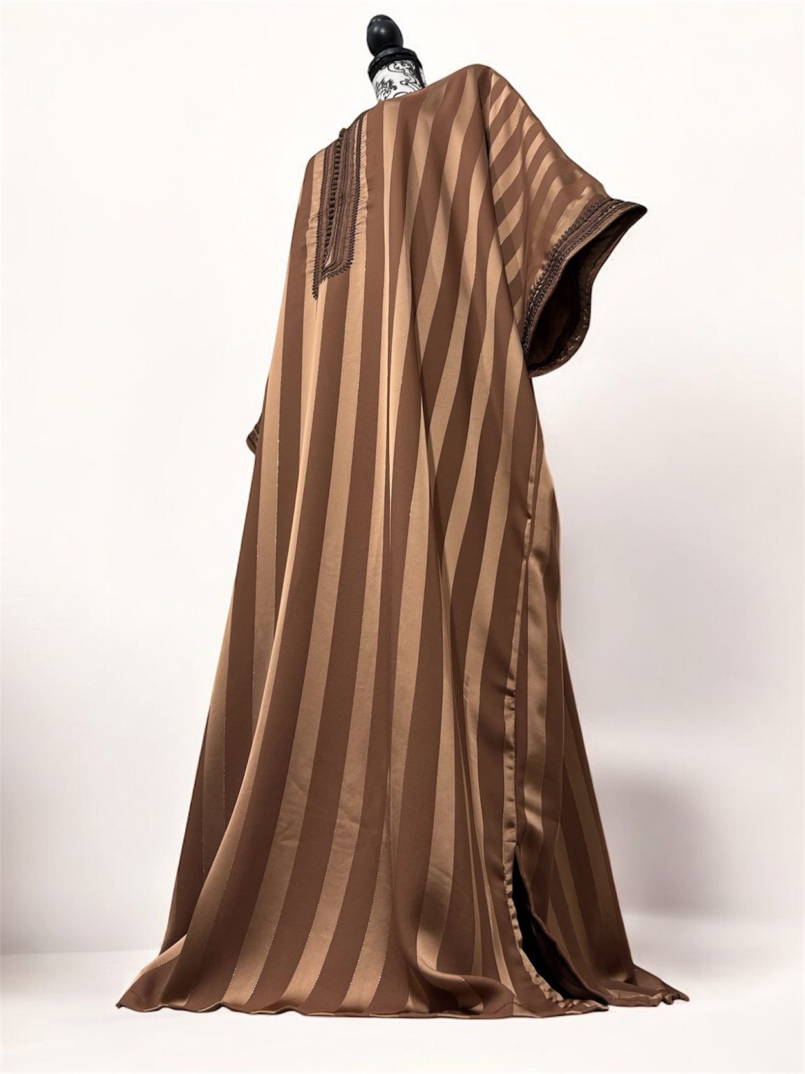 Élégance naturelle et éclat discret : ce caftan papillon à rayures satinées est un véritable bijou de simplicité raffinée. Sa coupe ample et fluide offre un confort absolu, tandis que les broderies délicates au col et sur les manches apportent une touche artisanale authentique.