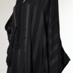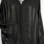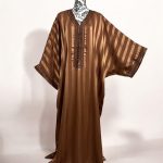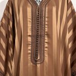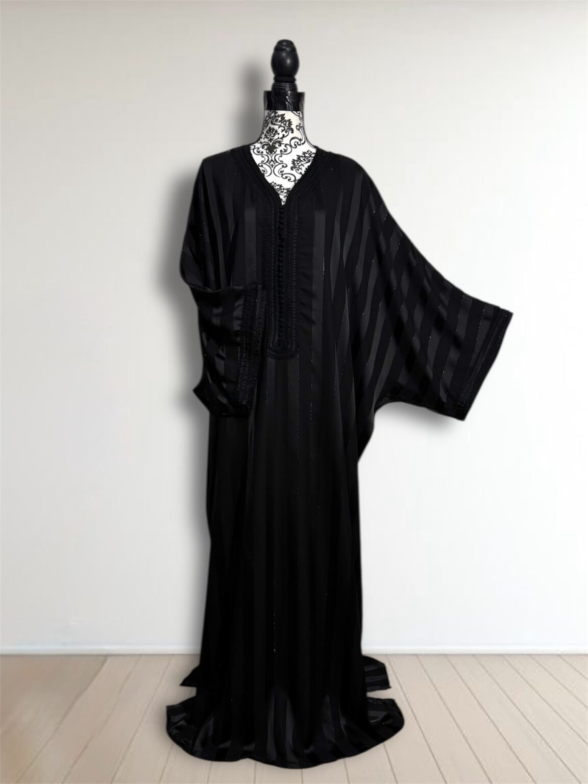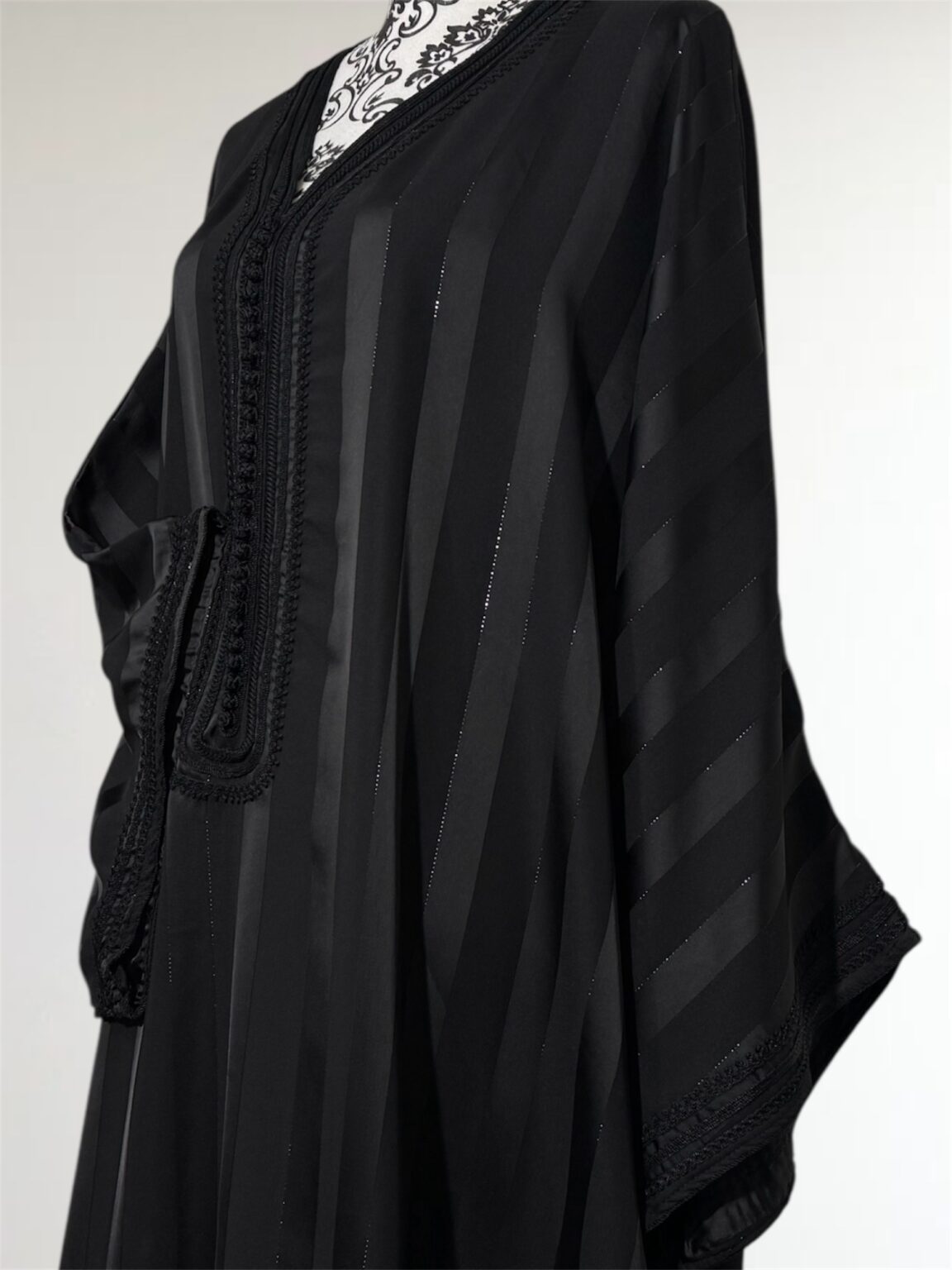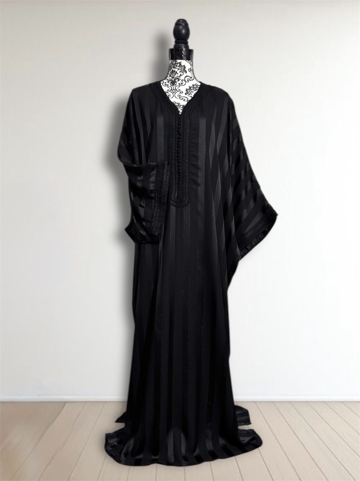 Élégance naturelle et éclat discret : ce caftan papillon à rayures satinées est un véritable bijou de simplicité raffinée. Sa coupe ample et fluide offre un confort absolu, tandis que les broderies délicates au col et sur les manches apportent une touche artisanale authentique.
