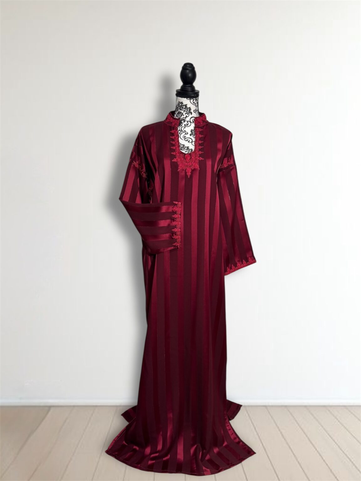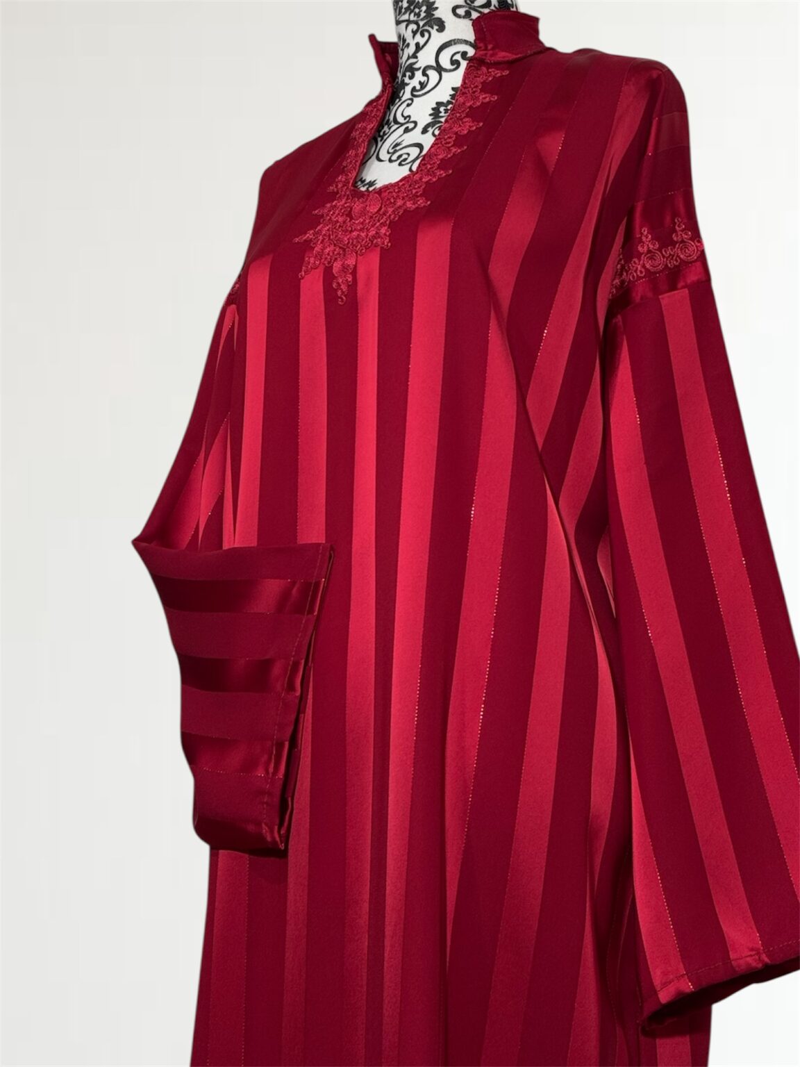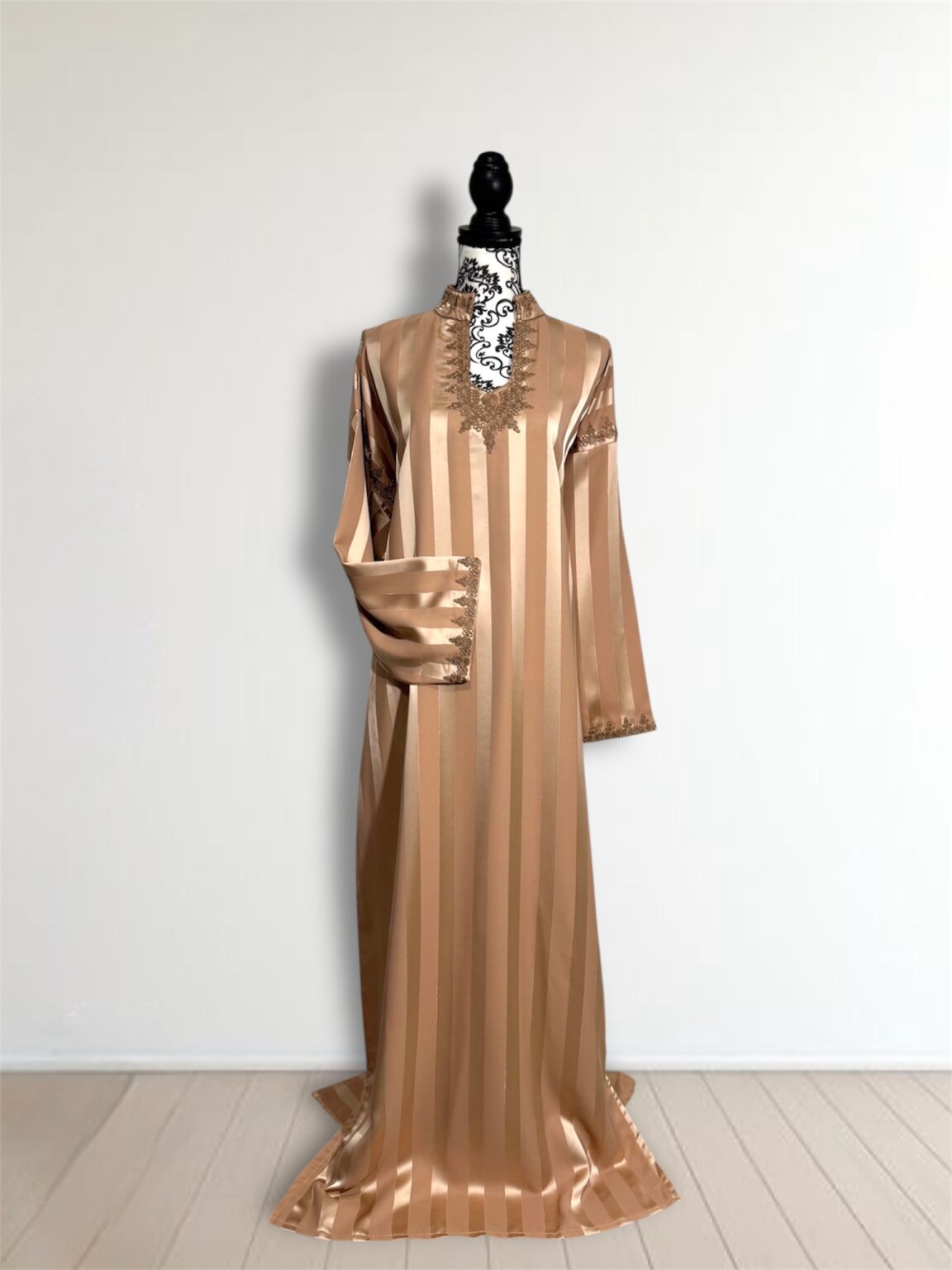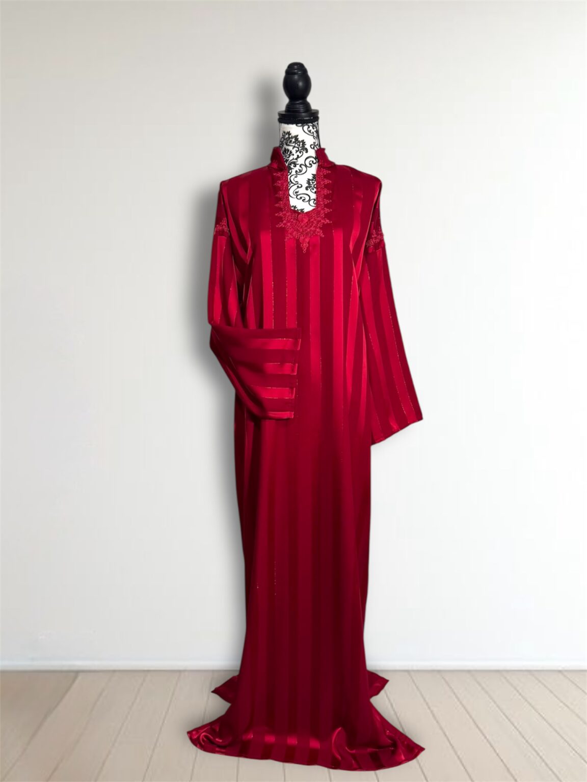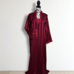 Avec ses manches longues finement travaillées et sa coupe fluide qui épouse le corps sans le contraindre, cette robe est idéale pour les occasions spéciales, les fêtes ou les soirées de célébration. Chaque détail est pensé pour sublimer la femme qui la porte.