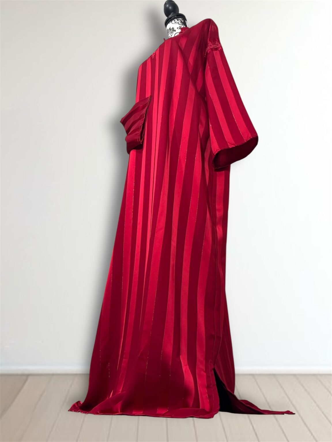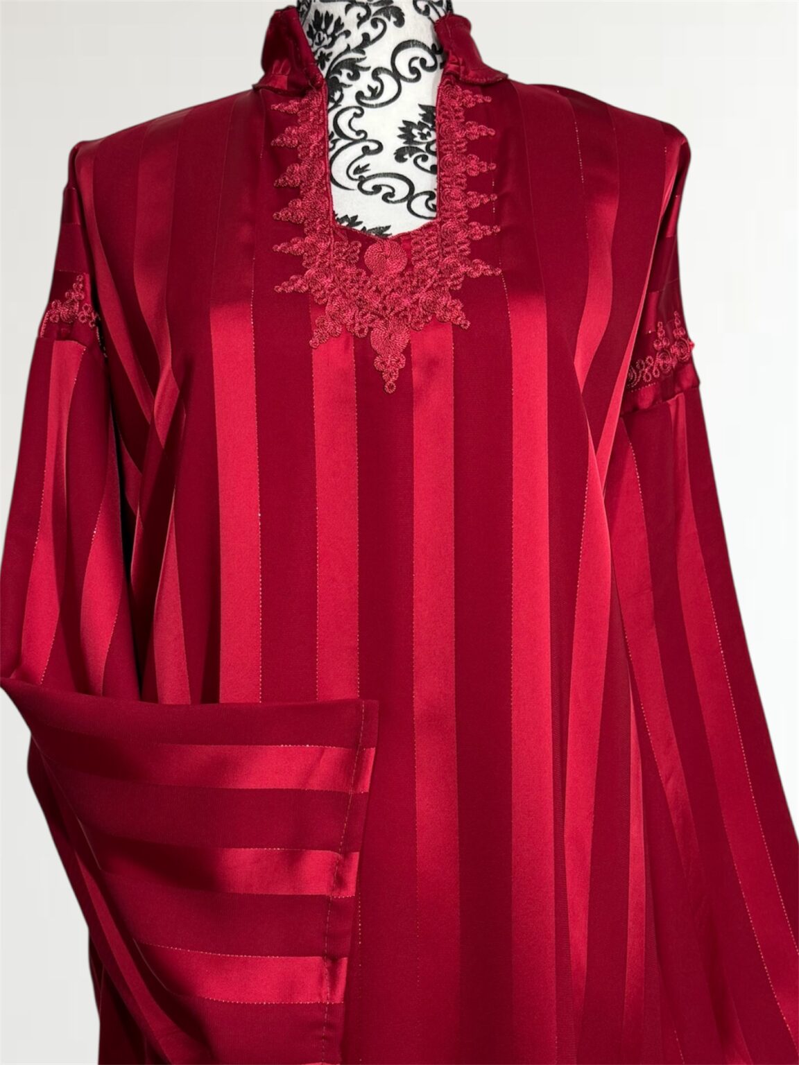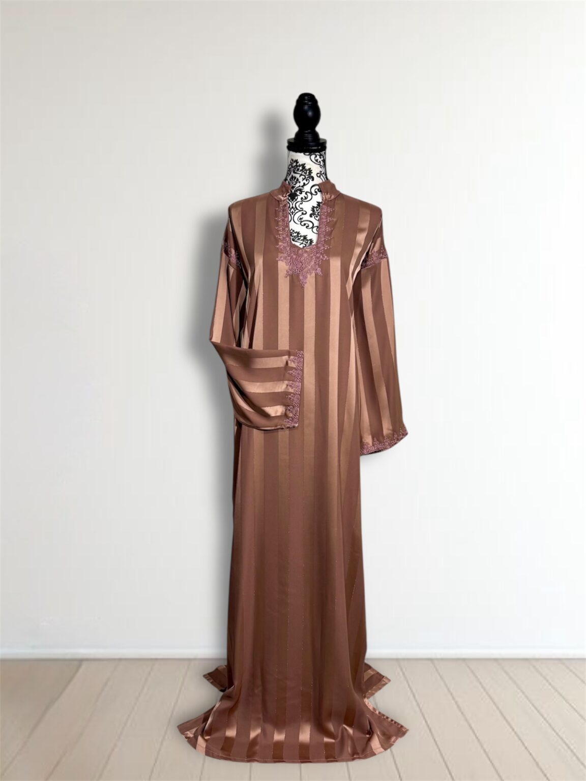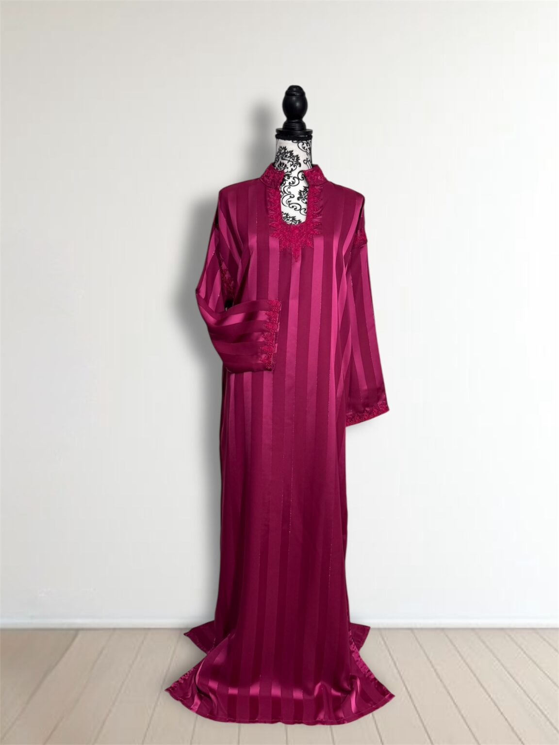 Avec ses manches longues finement travaillées et sa coupe fluide qui épouse le corps sans le contraindre, cette robe est idéale pour les occasions spéciales, les fêtes ou les soirées de célébration. Chaque détail est pensé pour sublimer la femme qui la porte.