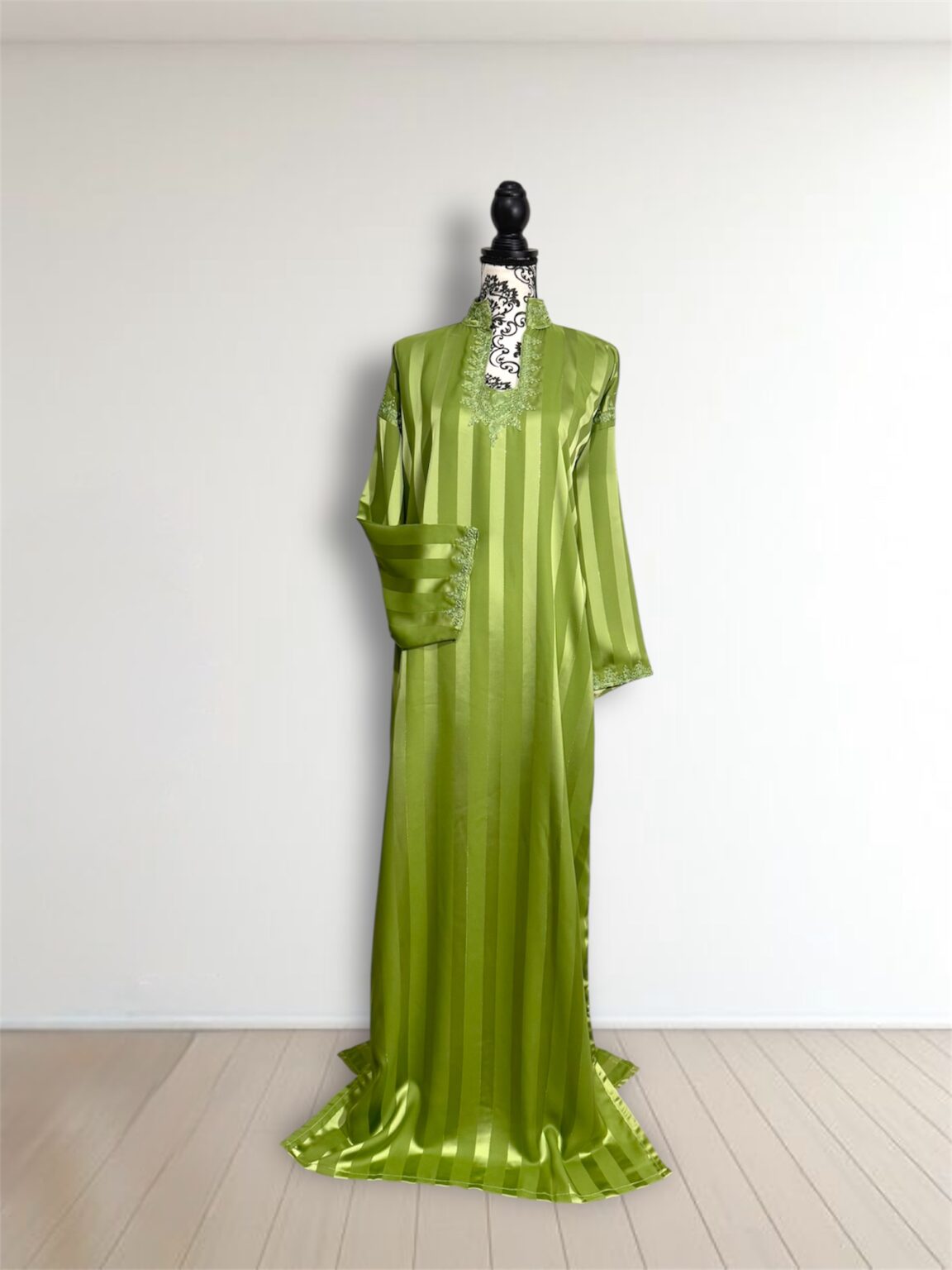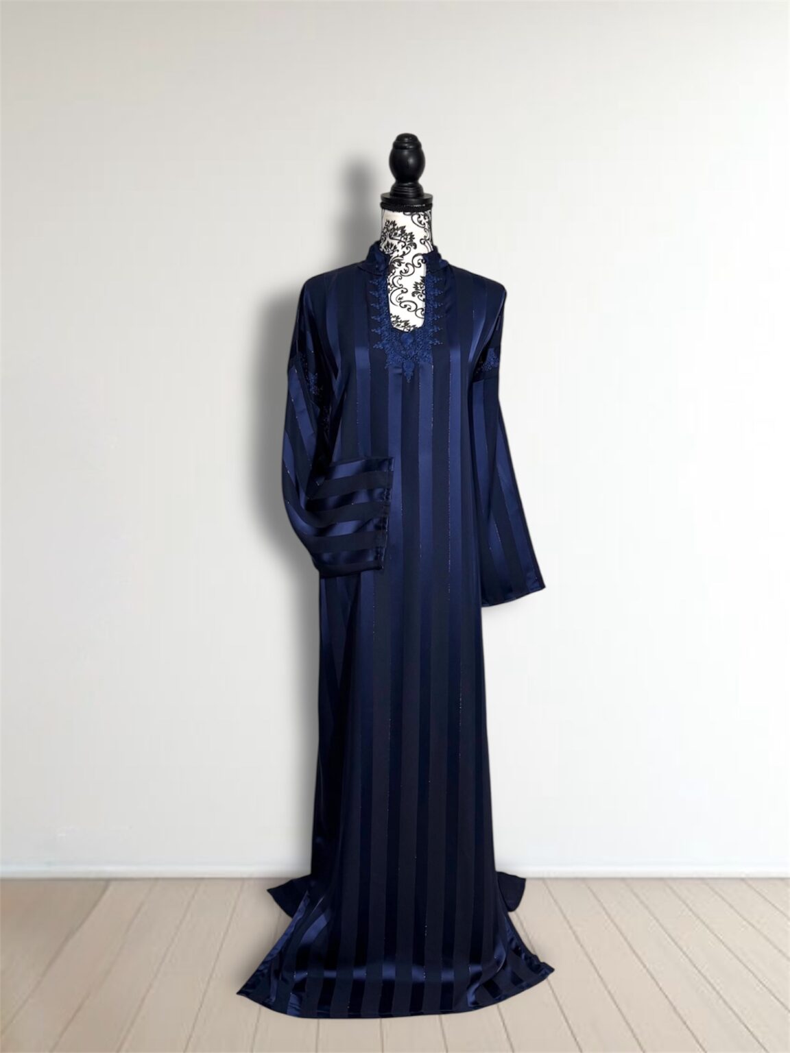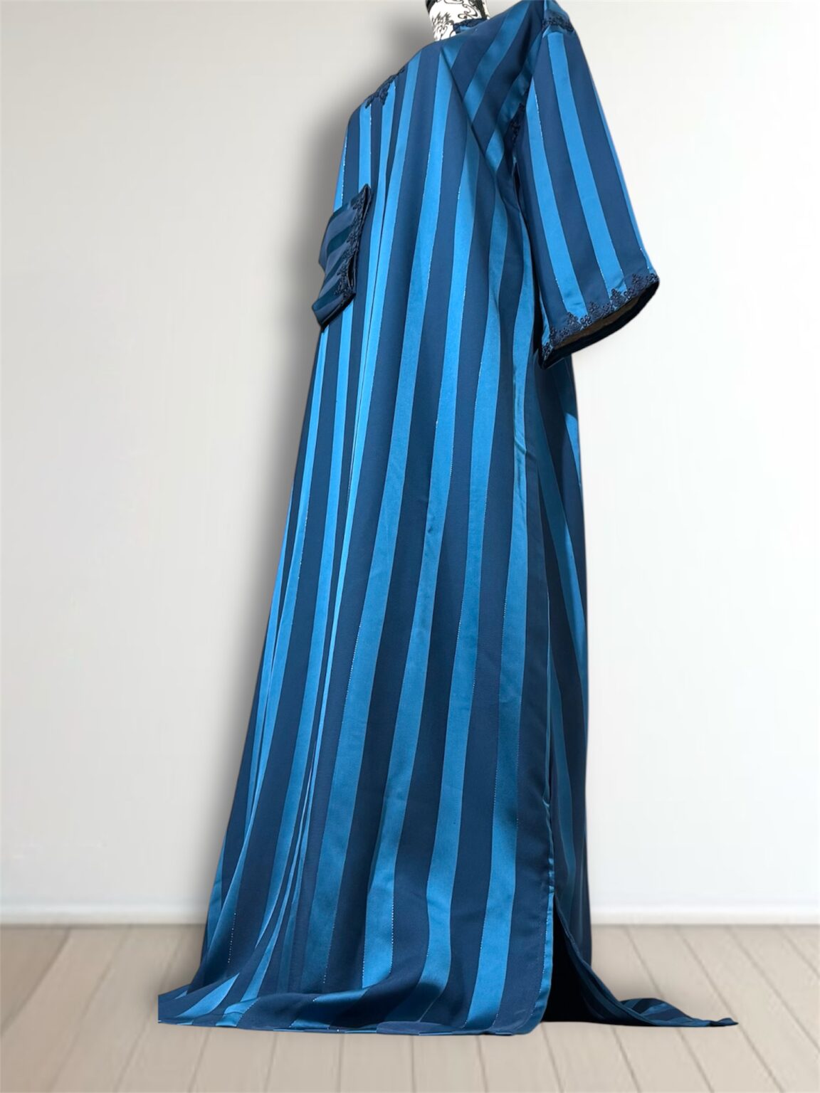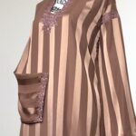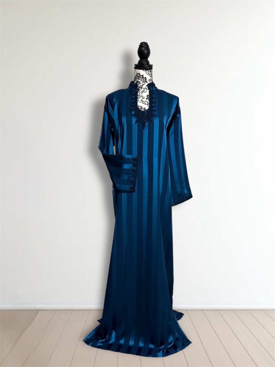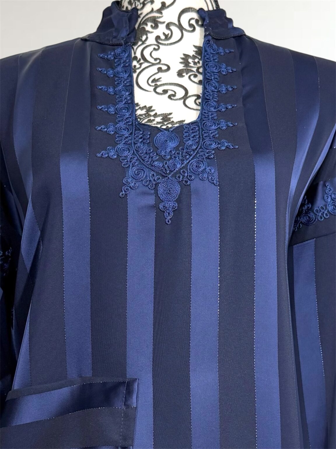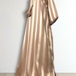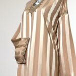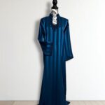 Laissez-vous séduire par l’élégance intemporelle de notre robe Jawhara royal. Confectionnée avec un tissu à rayures satinées qui capte la lumière à chaque mouvement, cette pièce incarne la grâce et le raffinement. Le col et l’encolure sont délicatement ornés de broderies ton sur ton, ajoutant une touche de tradition à une silhouette résolument moderne.