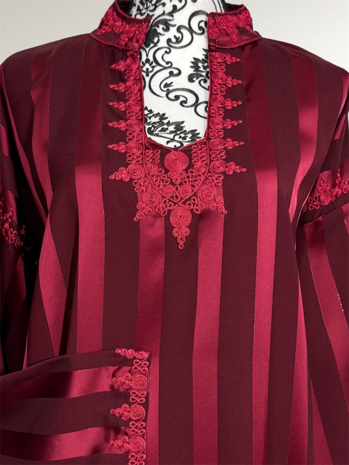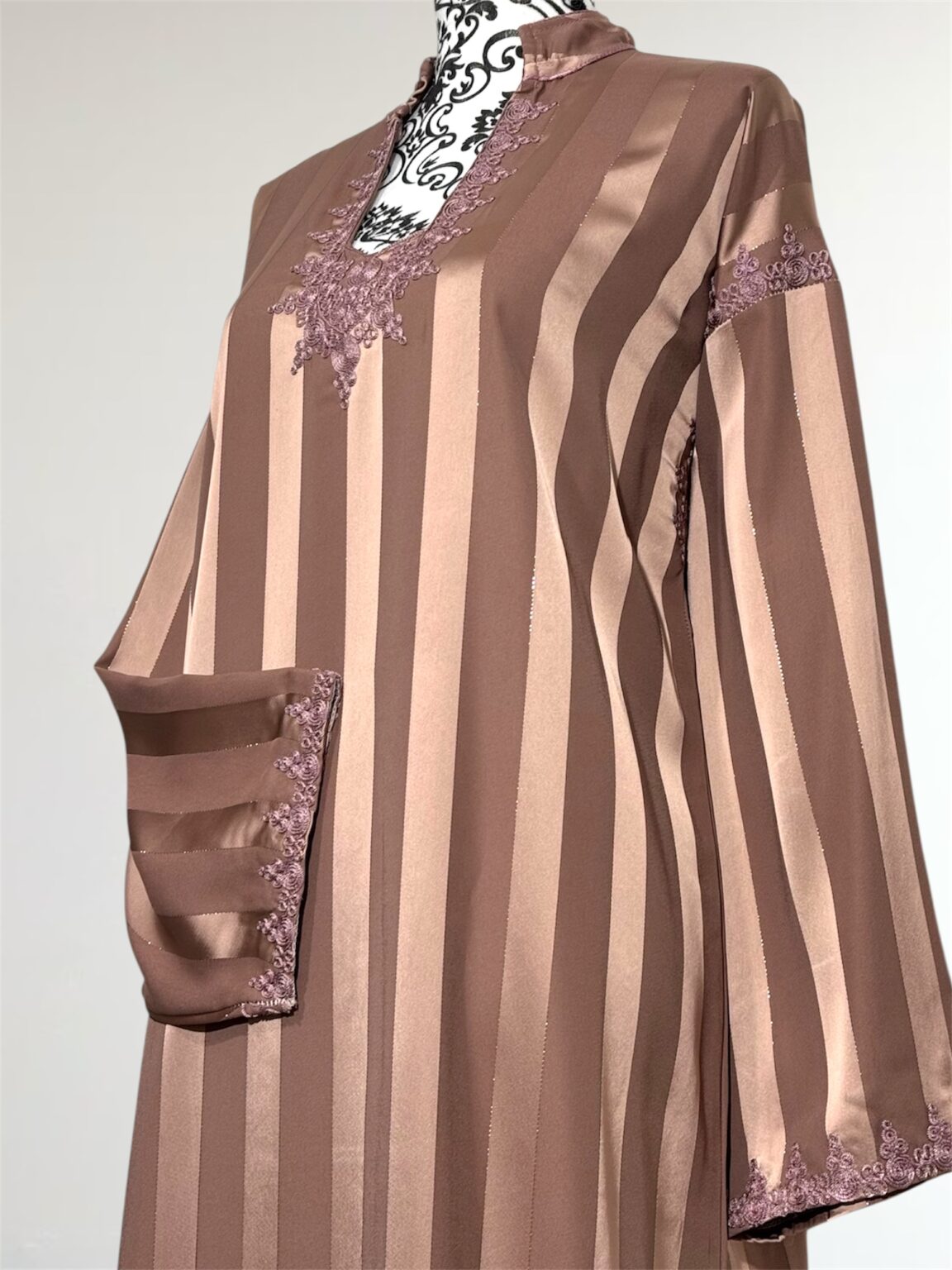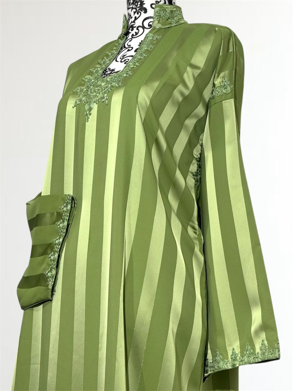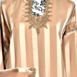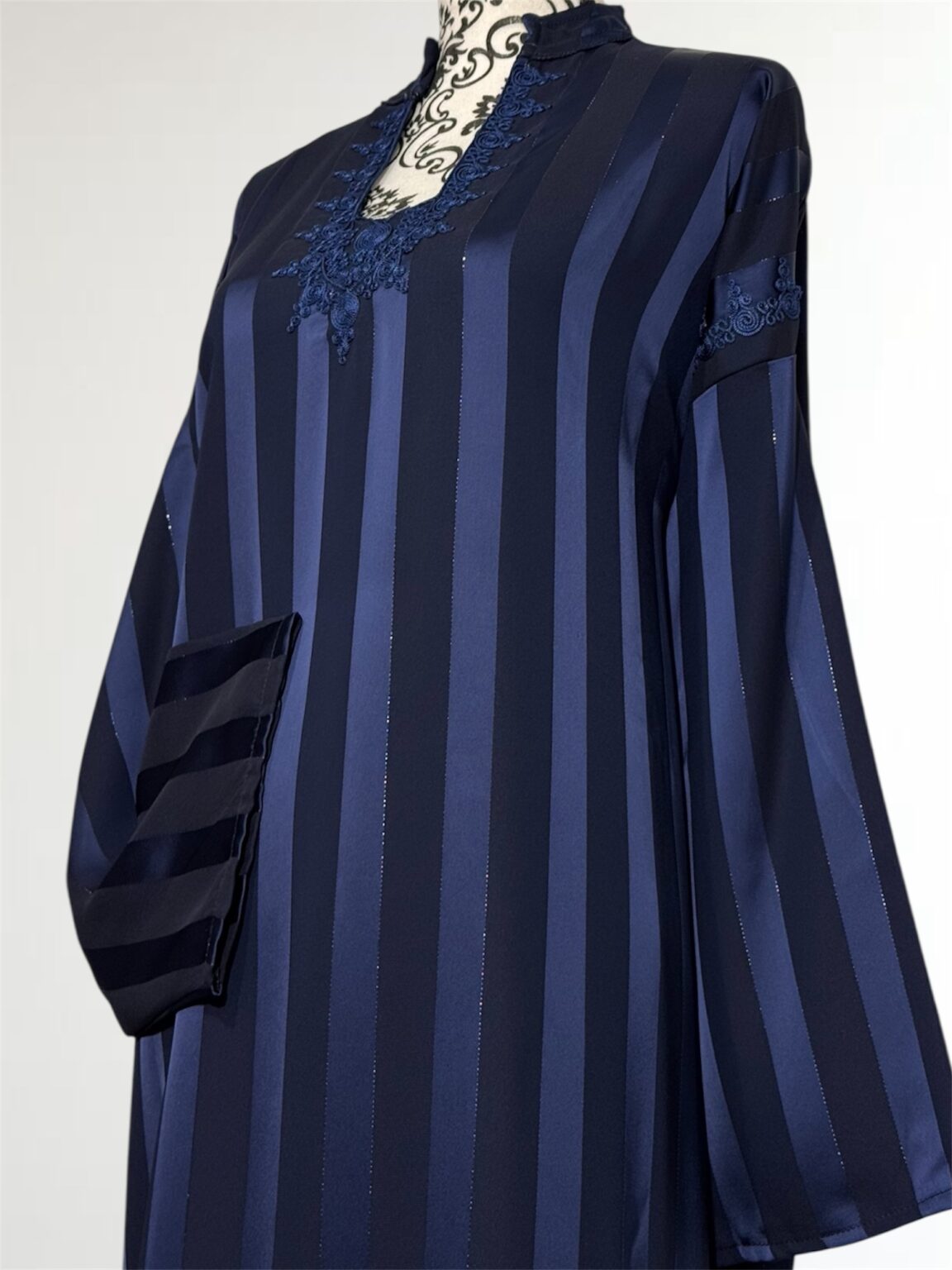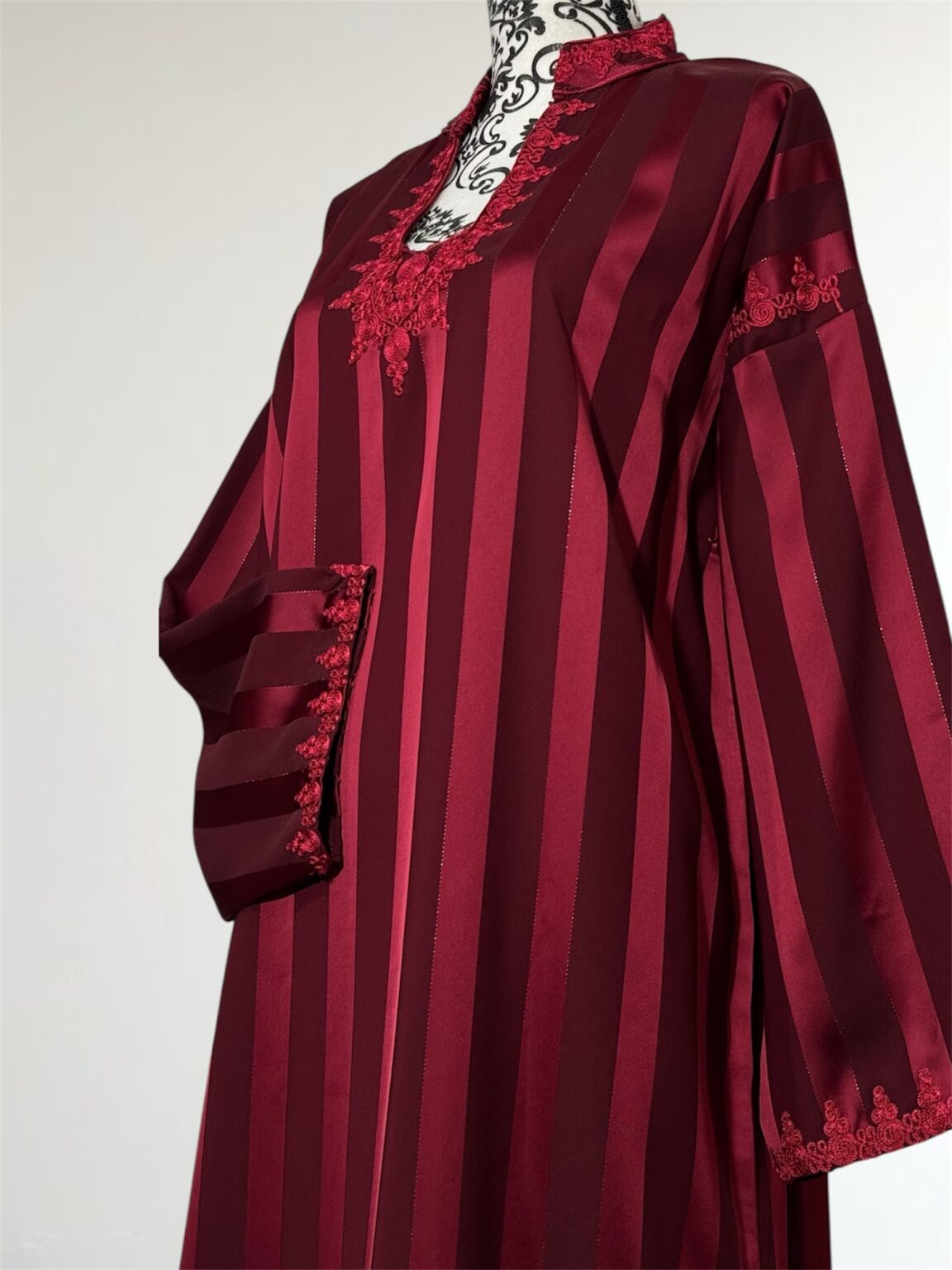 Laissez-vous séduire par l’élégance intemporelle de notre robe Jawhara royal. Confectionnée avec un tissu à rayures satinées qui capte la lumière à chaque mouvement, cette pièce incarne la grâce et le raffinement. Le col et l’encolure sont délicatement ornés de broderies ton sur ton, ajoutant une touche de tradition à une silhouette résolument moderne.
