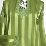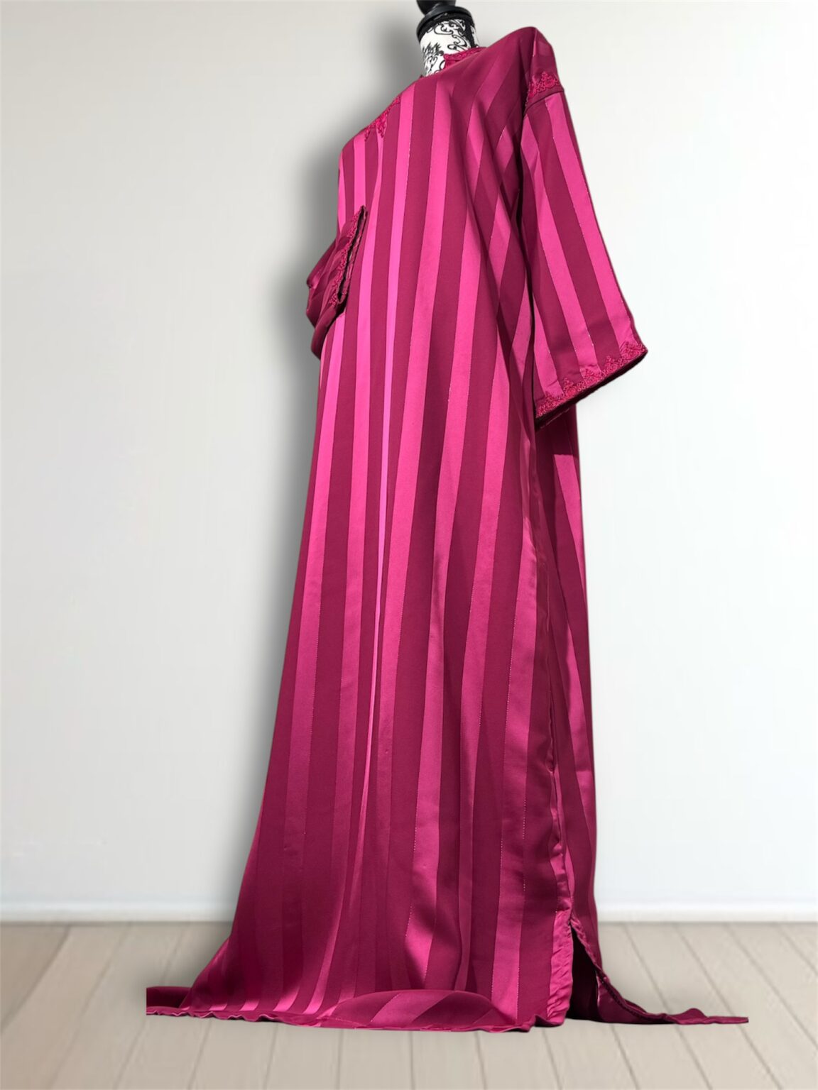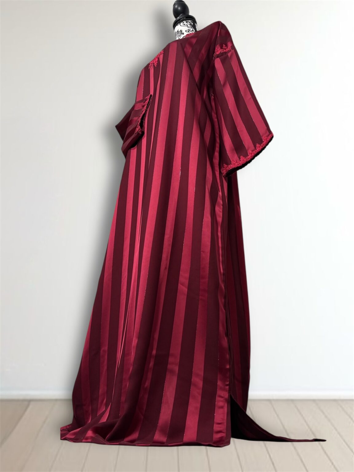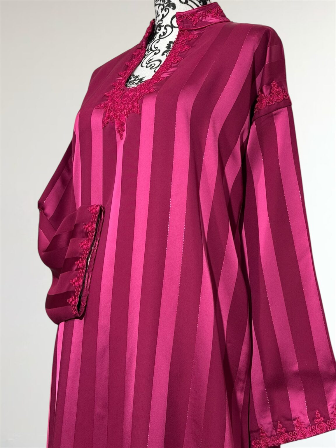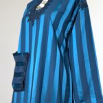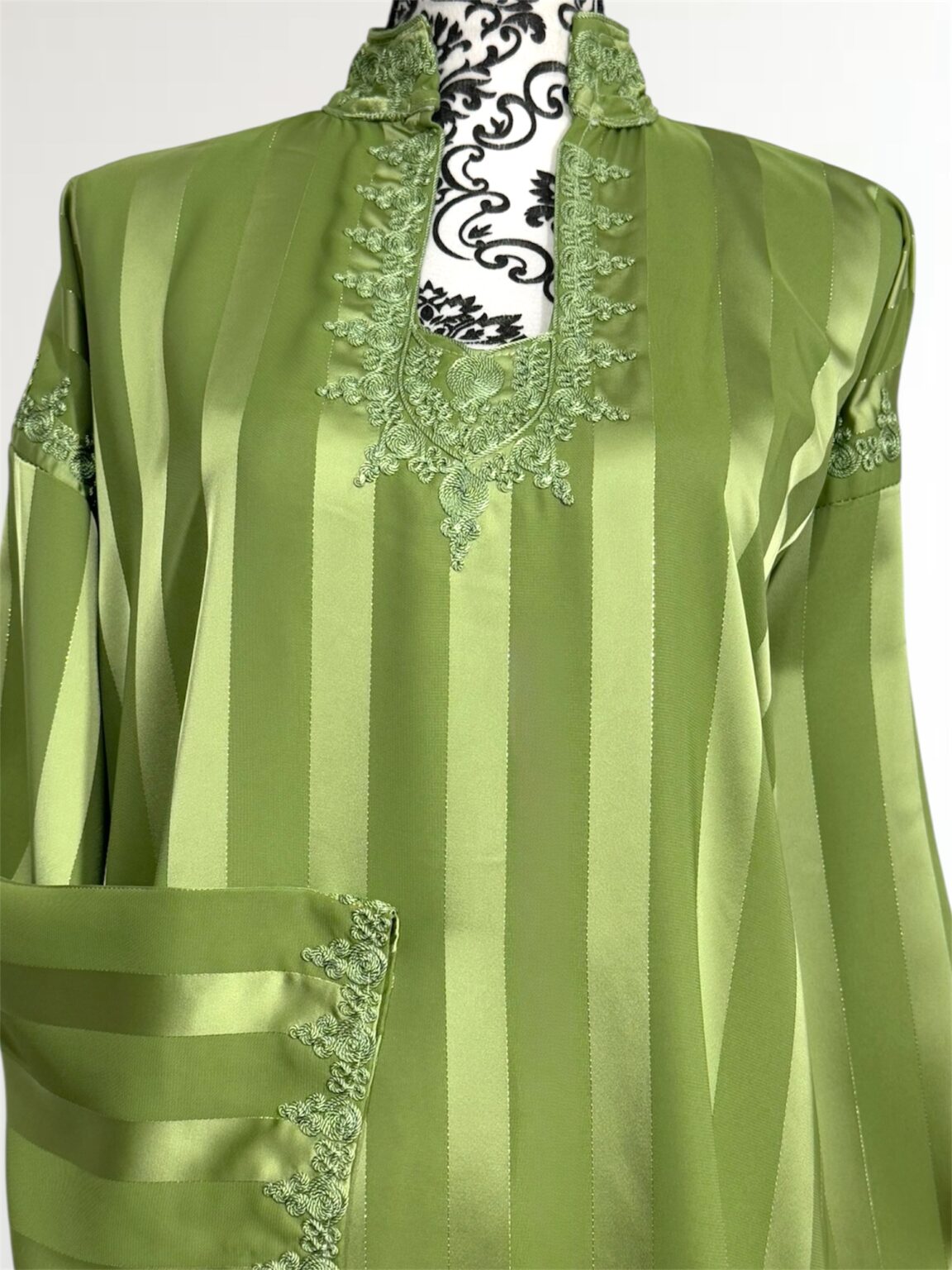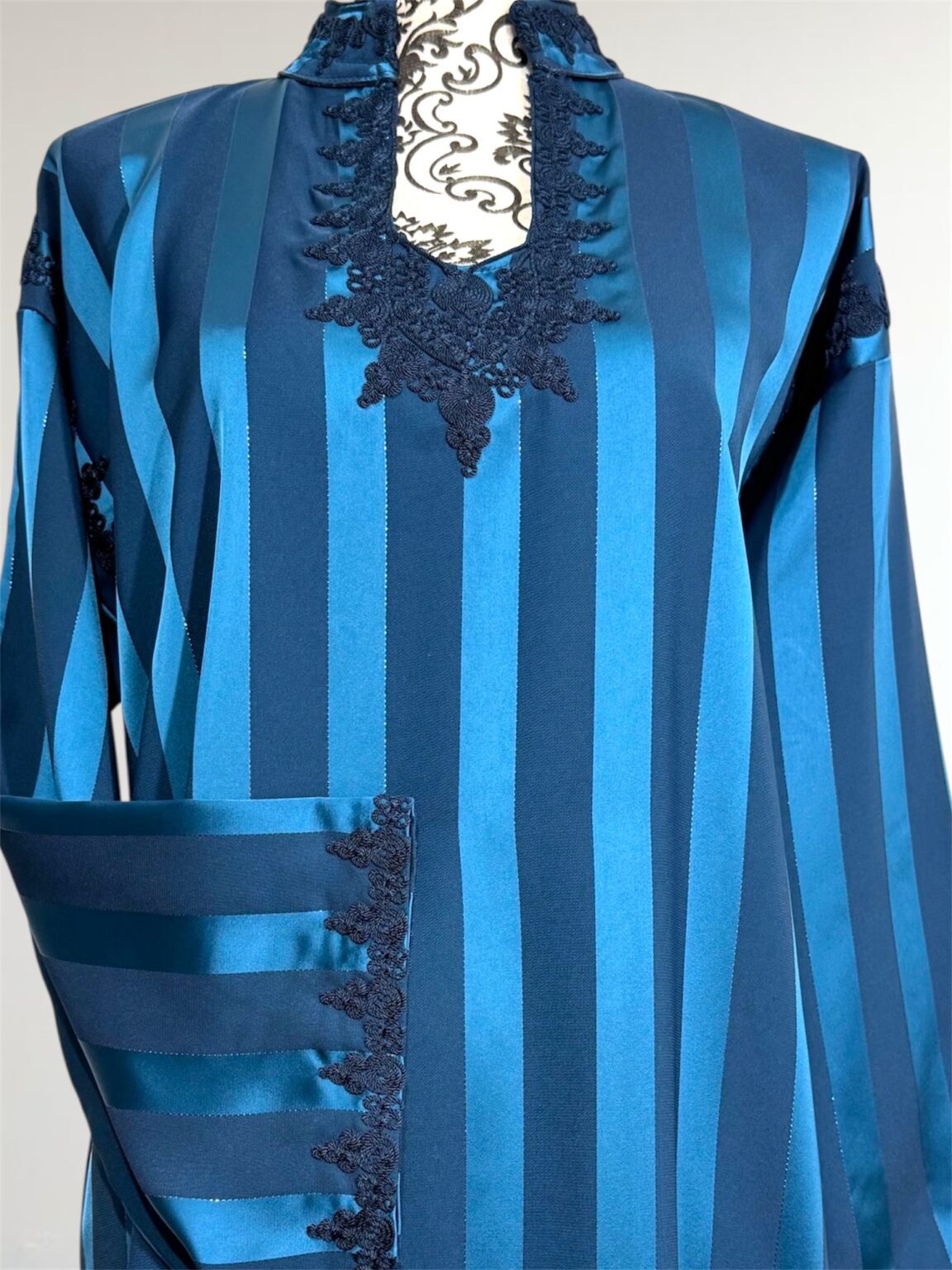 Laissez-vous séduire par l’élégance intemporelle de notre robe Jawhara royal. Confectionnée avec un tissu à rayures satinées qui capte la lumière à chaque mouvement, cette pièce incarne la grâce et le raffinement. Le col et l’encolure sont délicatement ornés de broderies ton sur ton, ajoutant une touche de tradition à une silhouette résolument moderne.